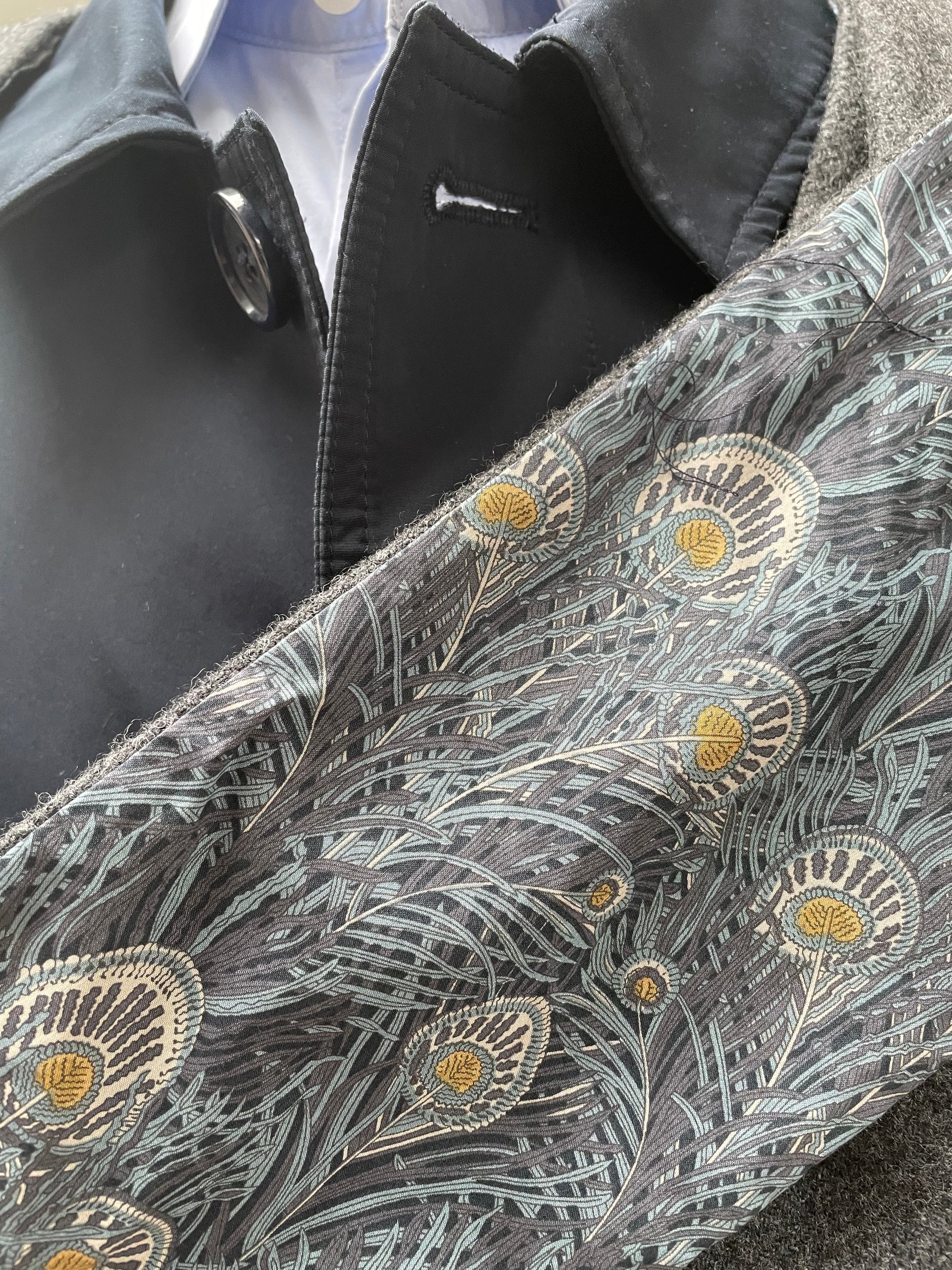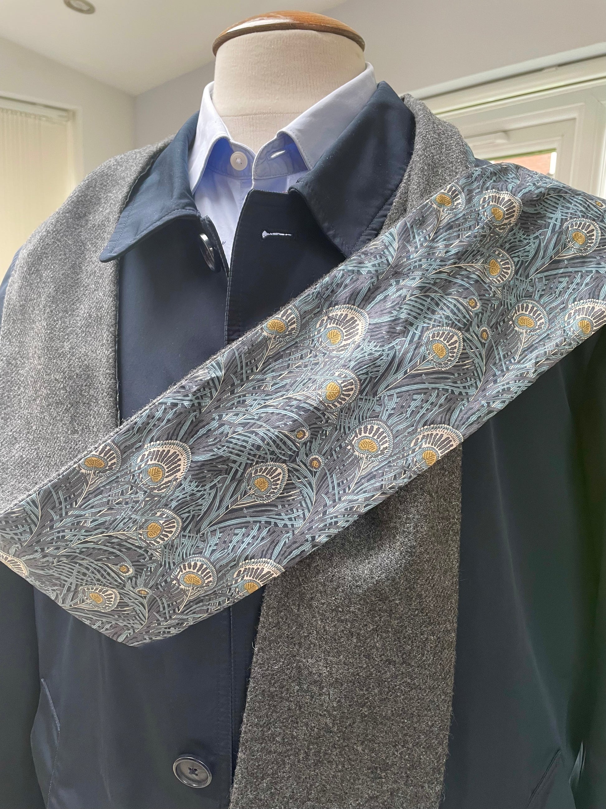 Grey merino lambswool and Liberty Queen Hera Tana Lawn cotton. The scarf is 2 metres in length and approximately 13cm in width.