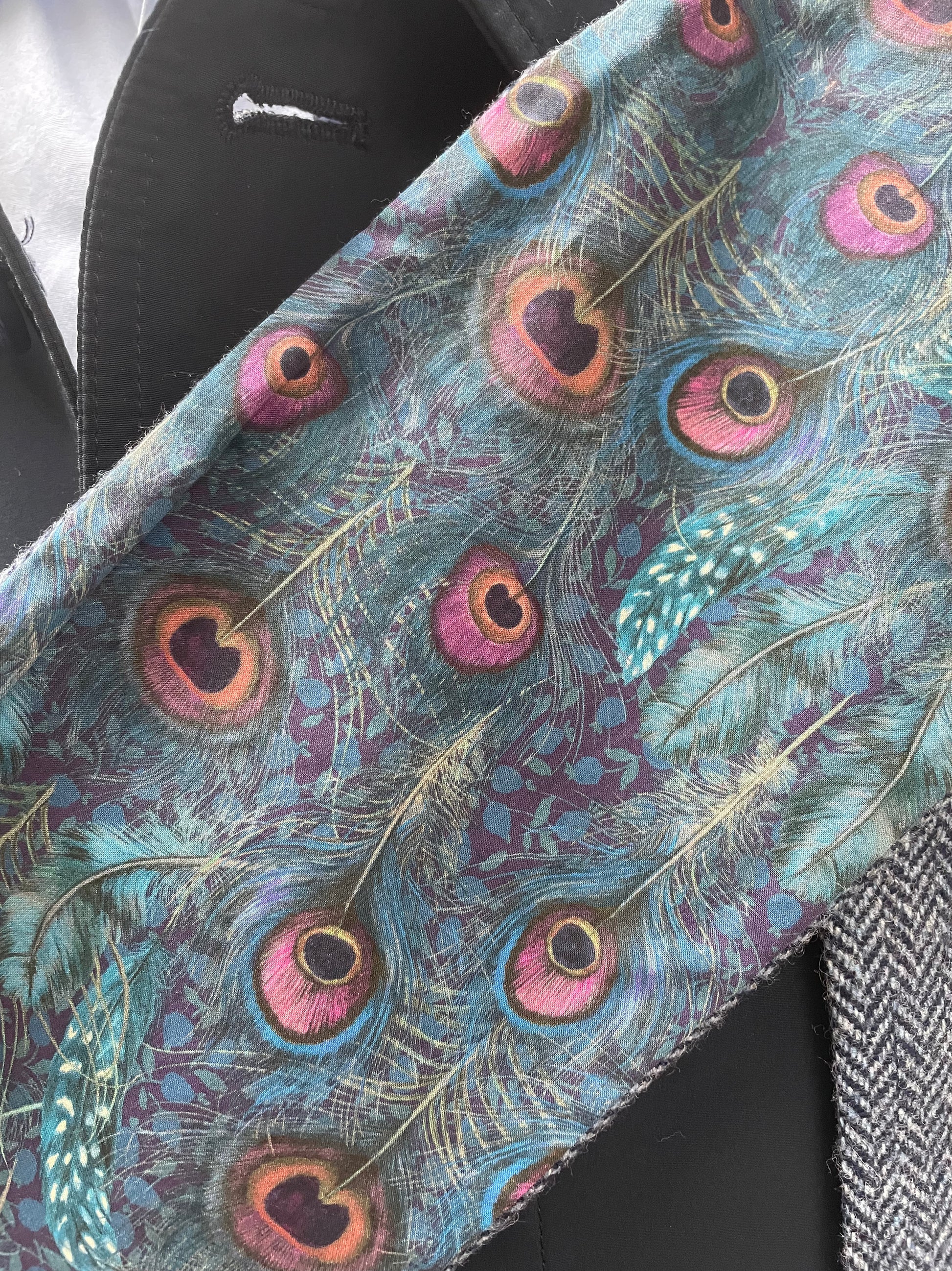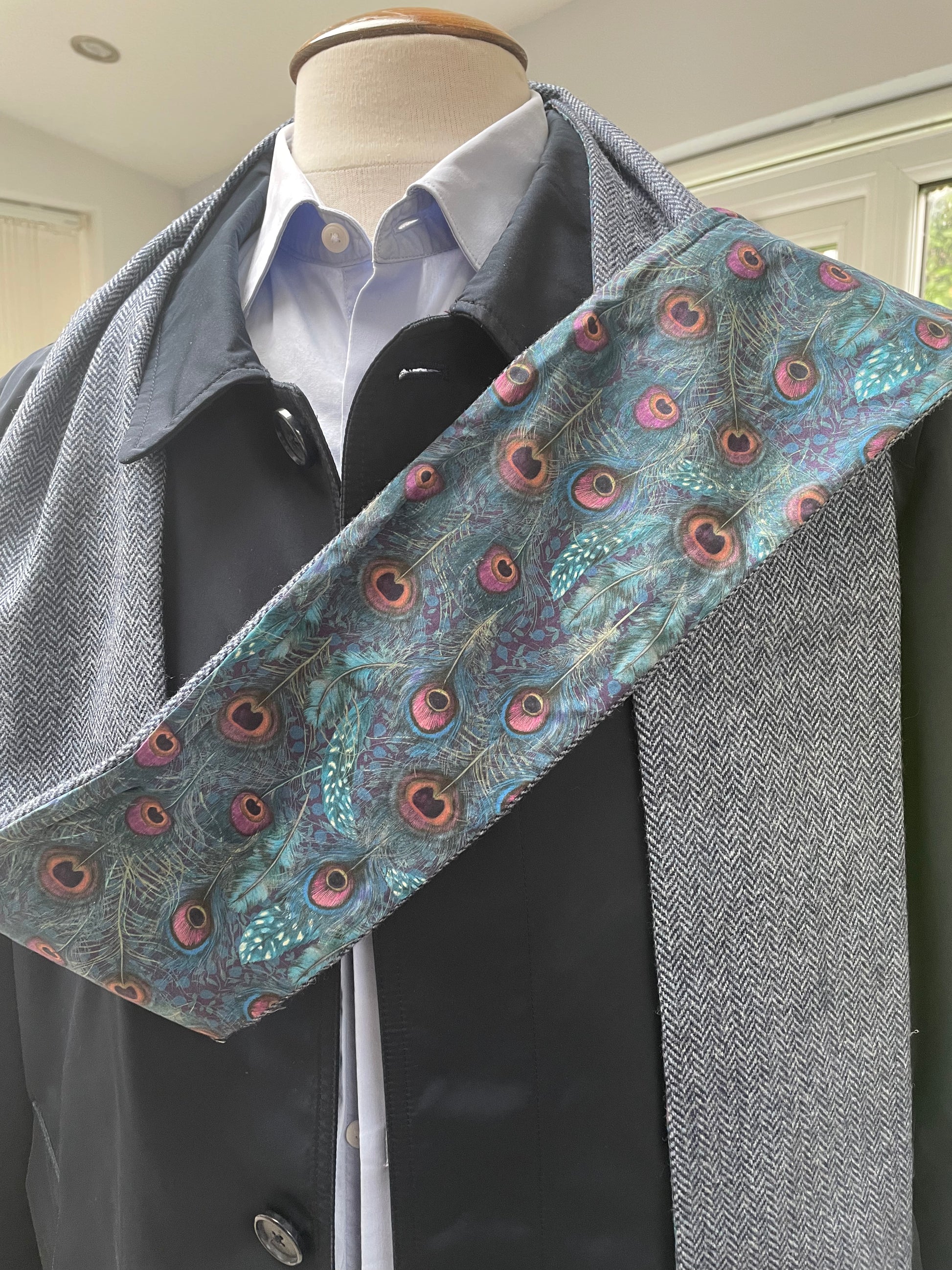 Mid-Blue merino lambswool and Liberty Peacock Manor Tana Lawn cotton. The scarf is 2 metres in length and approximately 13cm in width.