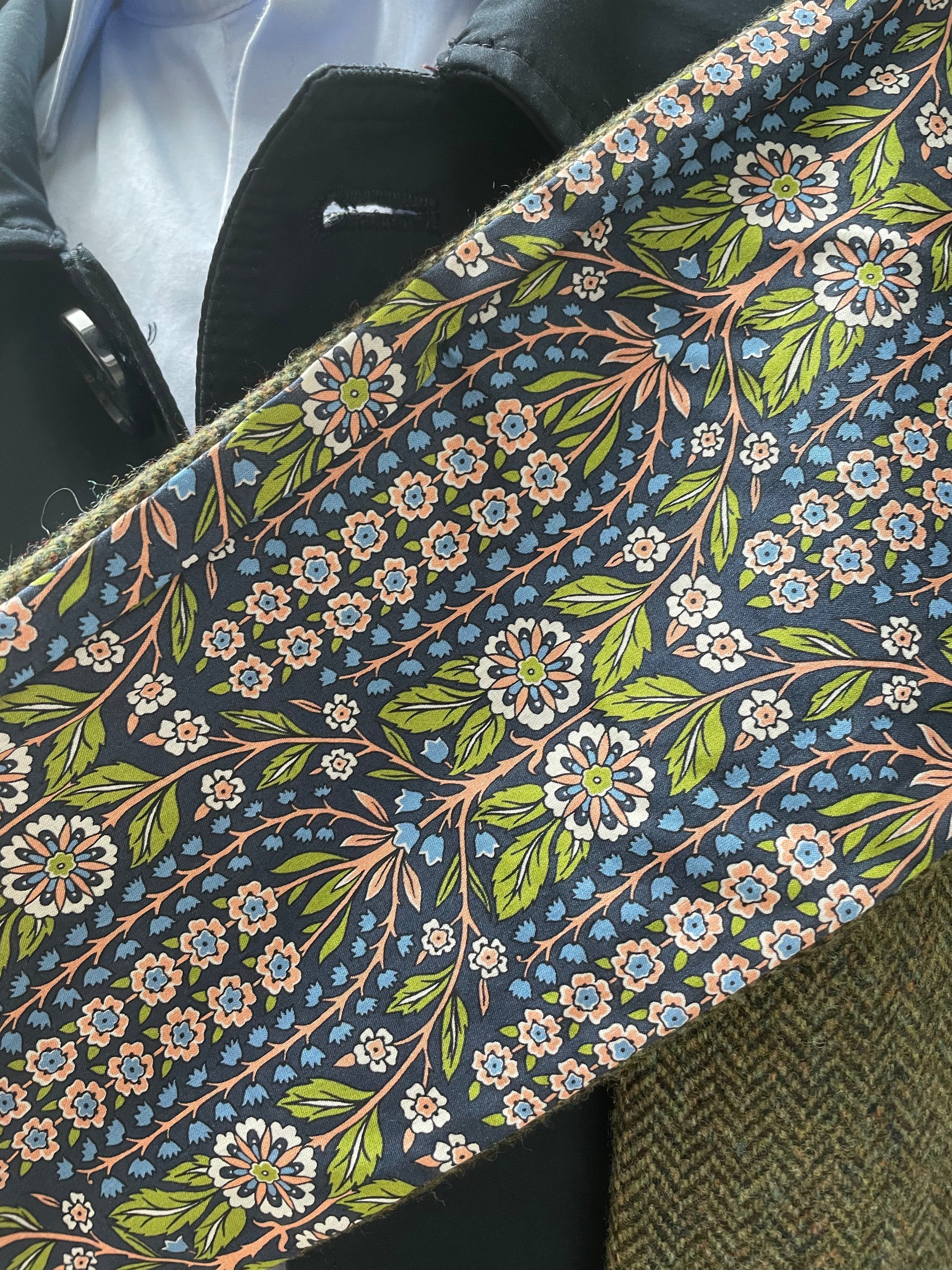 Camo merino lambswool and Liberty Tana Lawn cotton. The scarf is 2 metres in length and approximately 13cm in width.