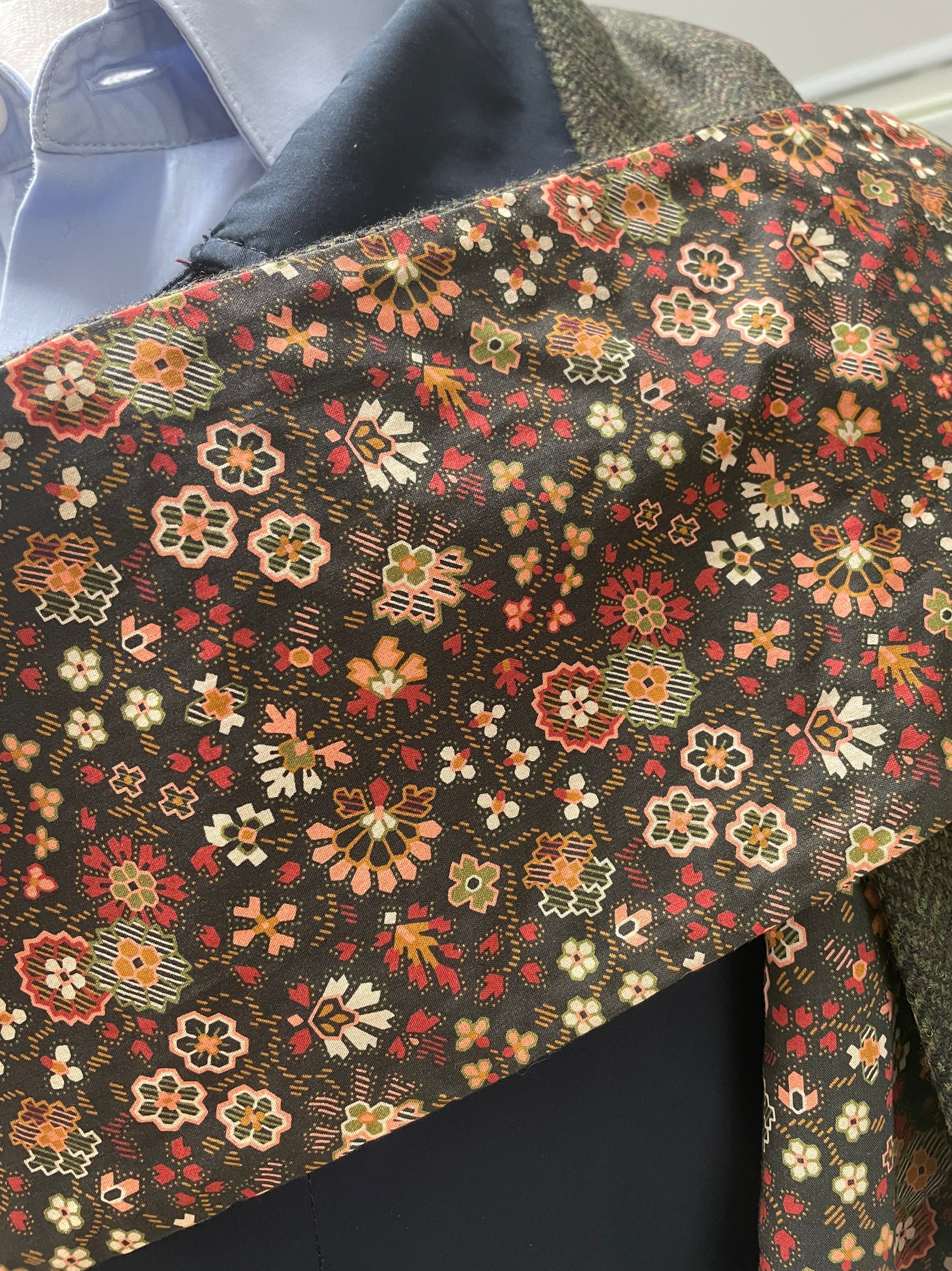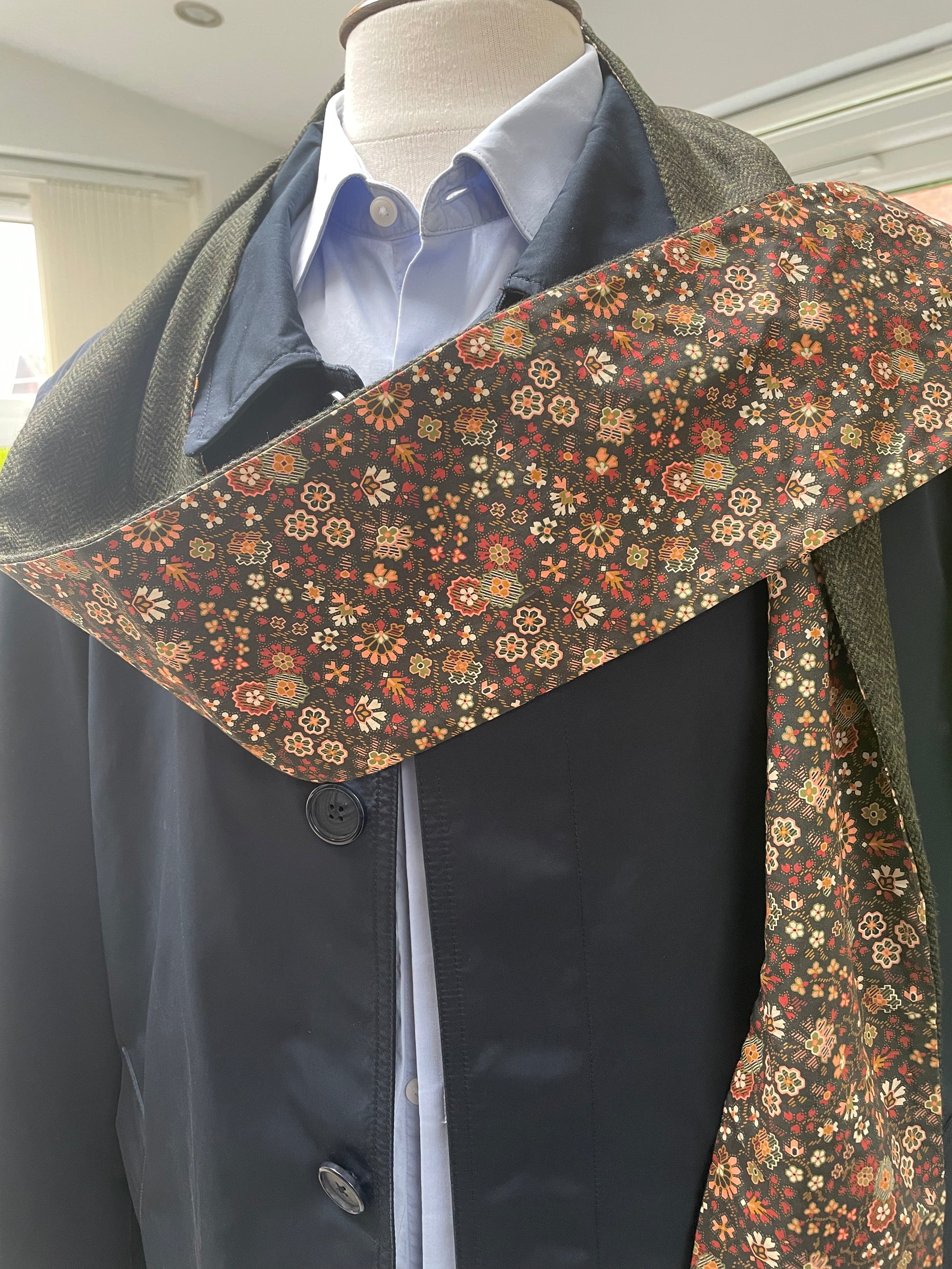 Forest merino lambswool and Liberty Wiltshire Tana Lawn cotton. The scarf is 2 metres in length and approximately 13cm in width.