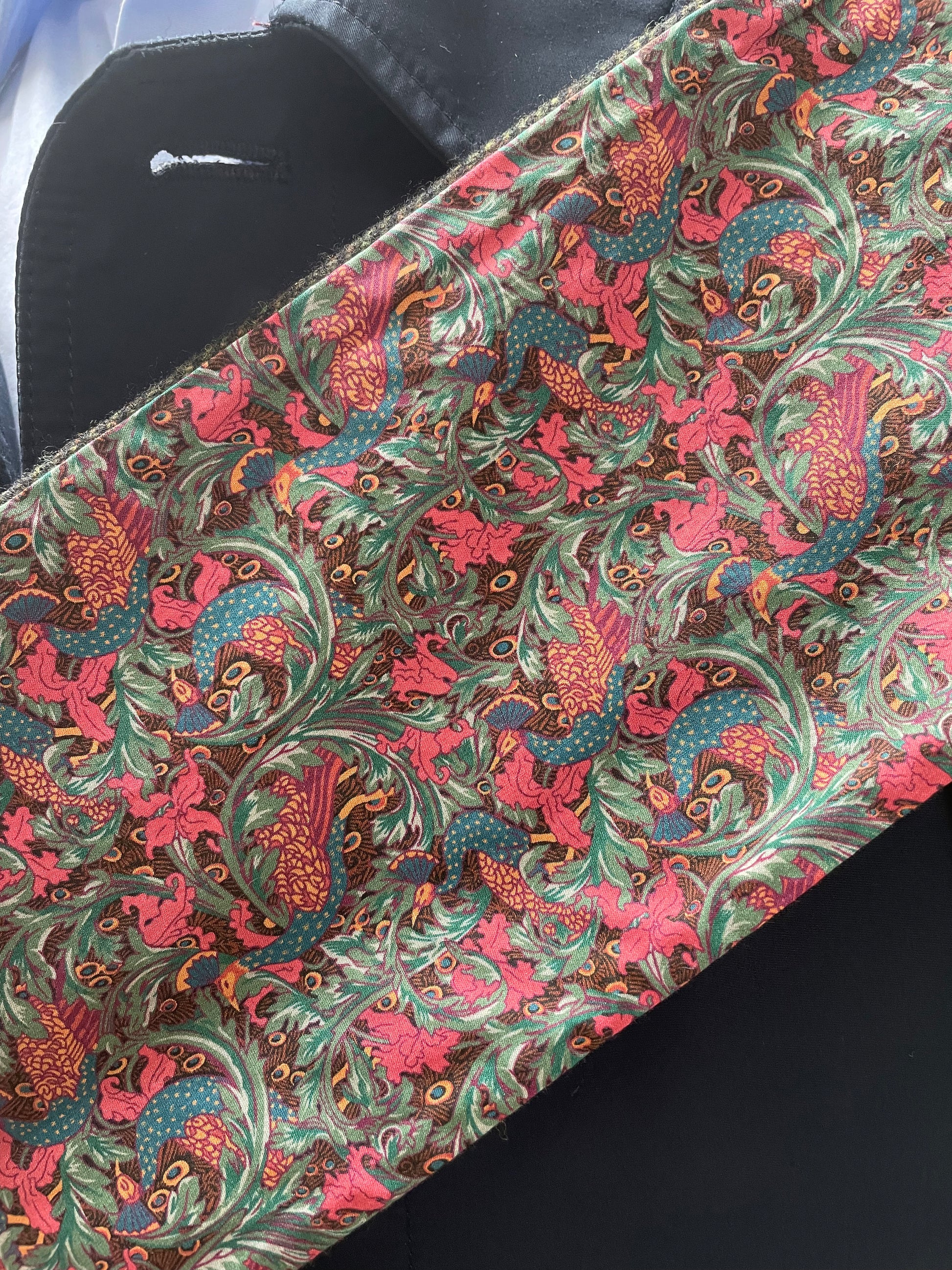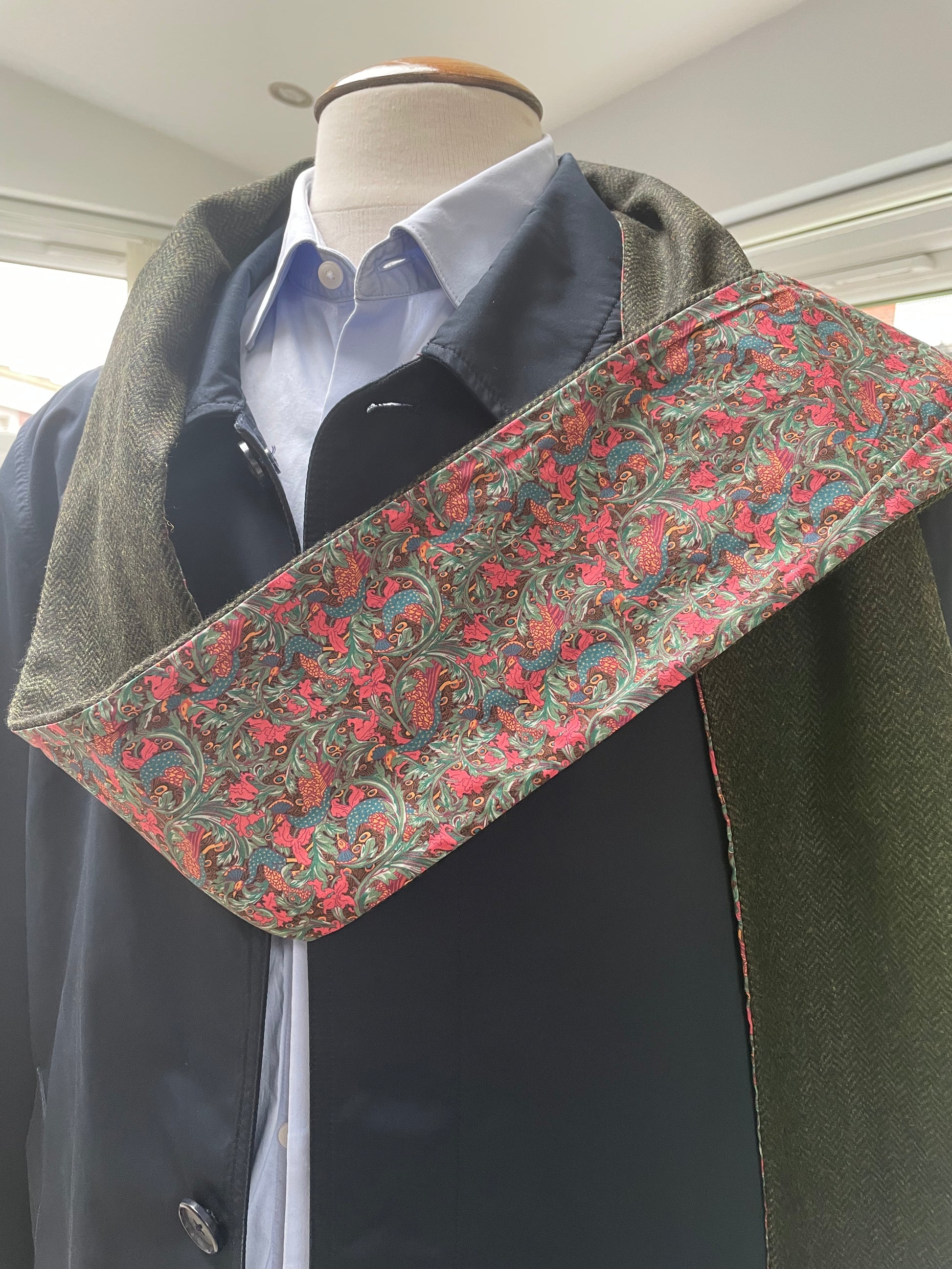 Forest merino lambswool and Liberty Edens Awakening Tana Lawn cotton. The scarf is 2 metres in length and approximately 13cm in width.