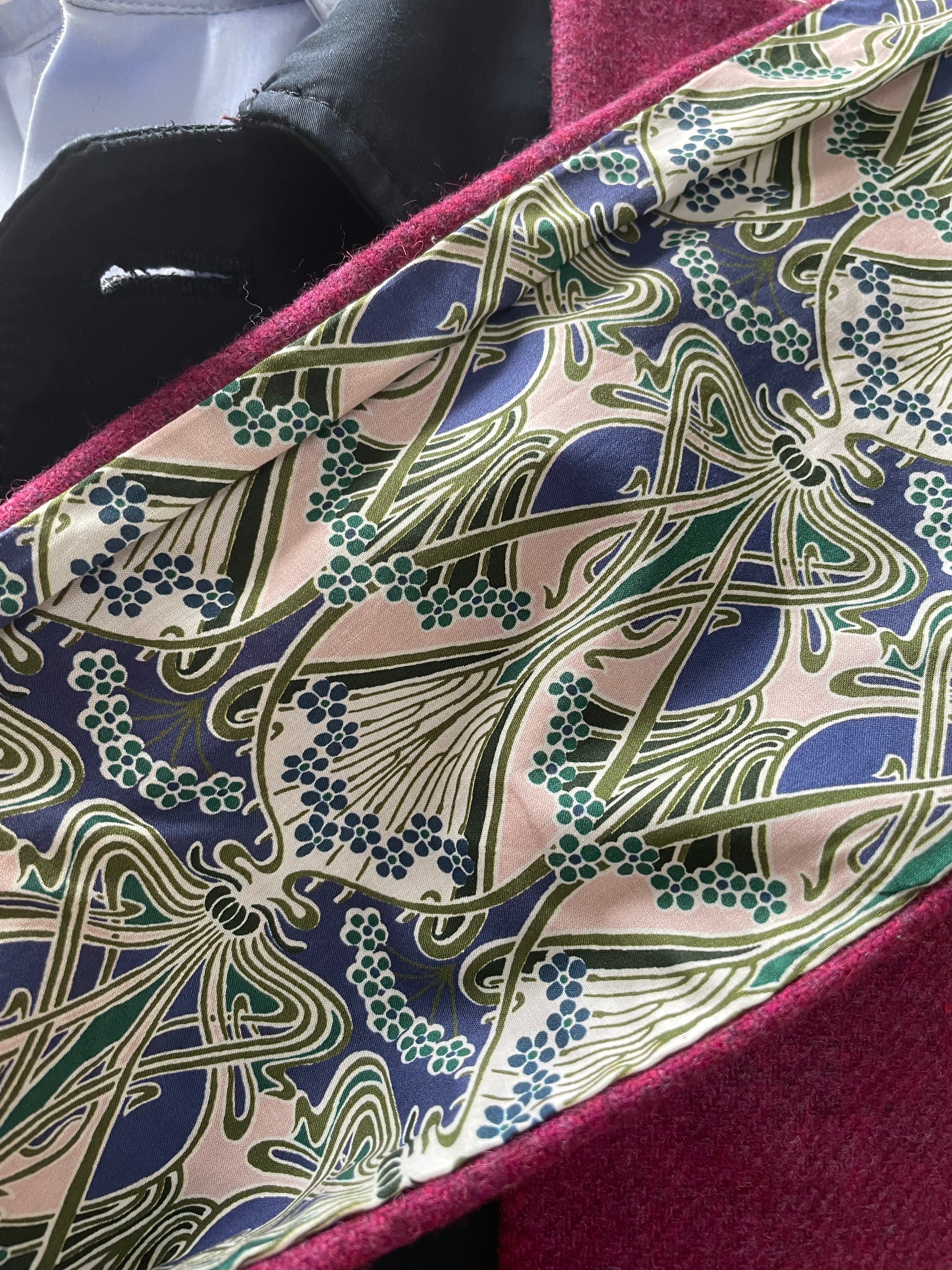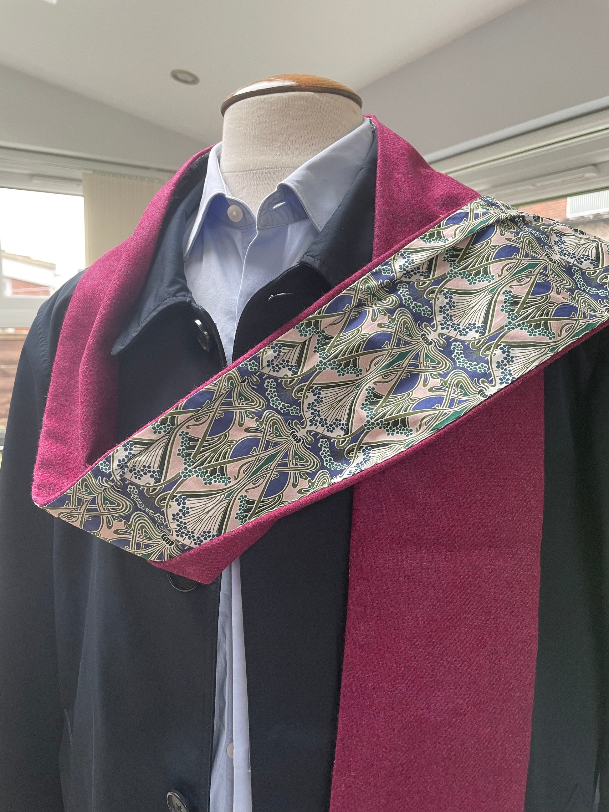 Cherry merino lambswool and Liberty Ianthe Tana Lawn cotton. The scarf is 2 metres in length and approximately 13cm in width.