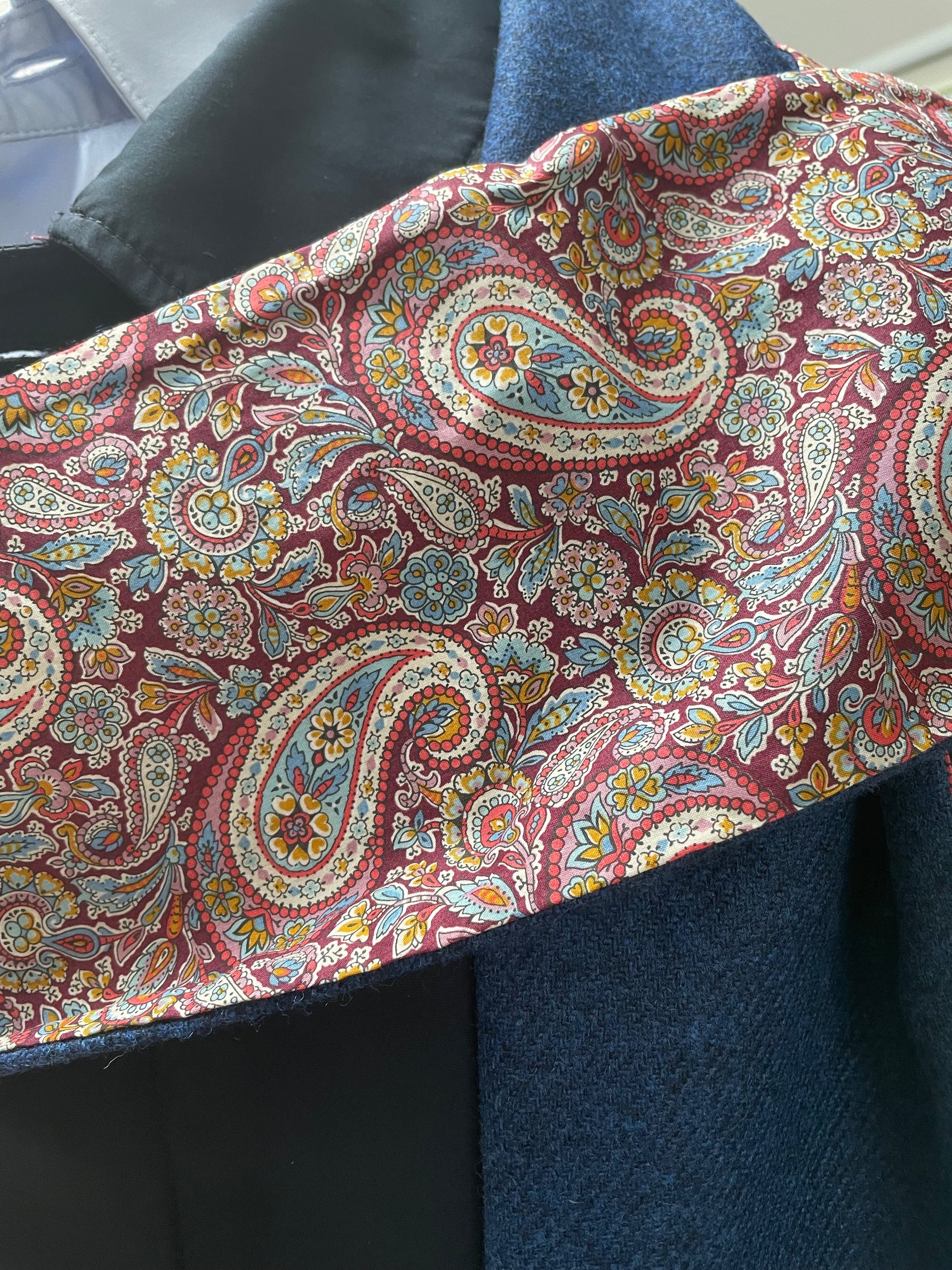Bright Blue merino lambswool and Liberty Lee Manor Tana Lawn cotton. The scarf is 2 metres in length and approximately 13cm in width.