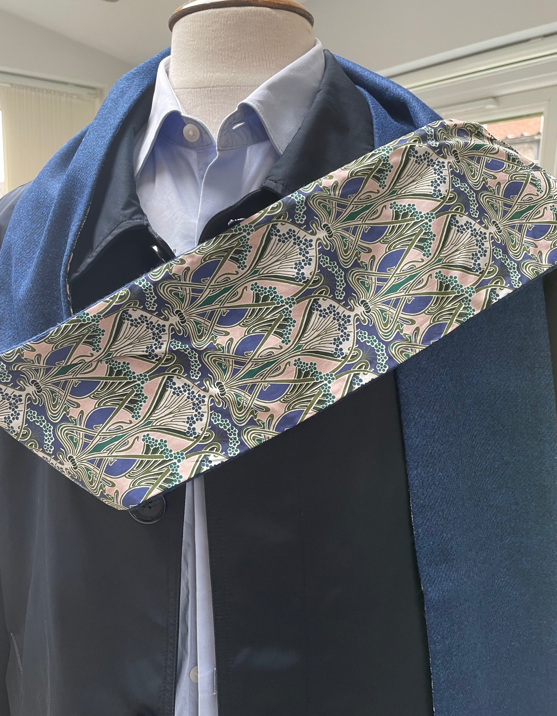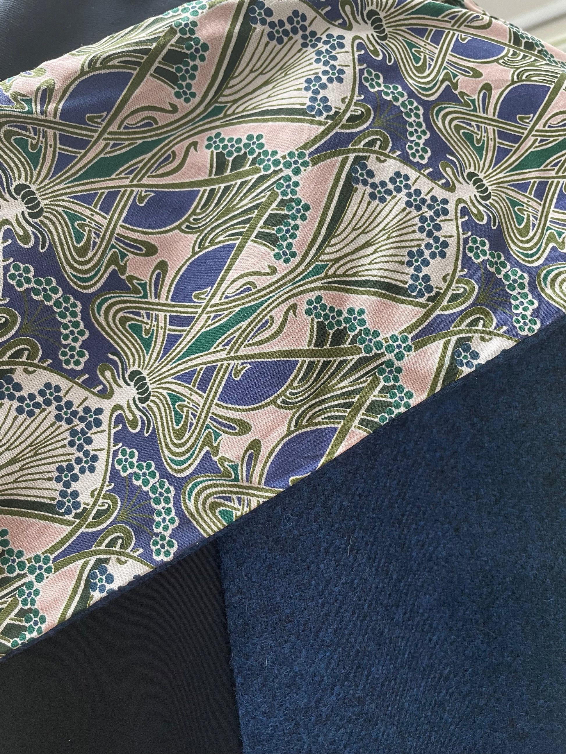 Bright Blue merino lambswool and Liberty Ianthe Tana Lawn cotton. The scarf is 2 metres in length and approximately 13cm in width.
