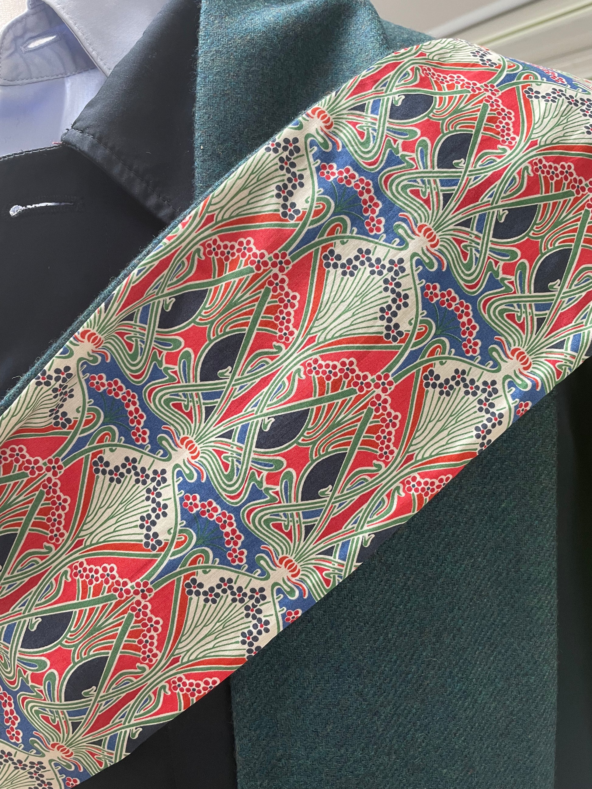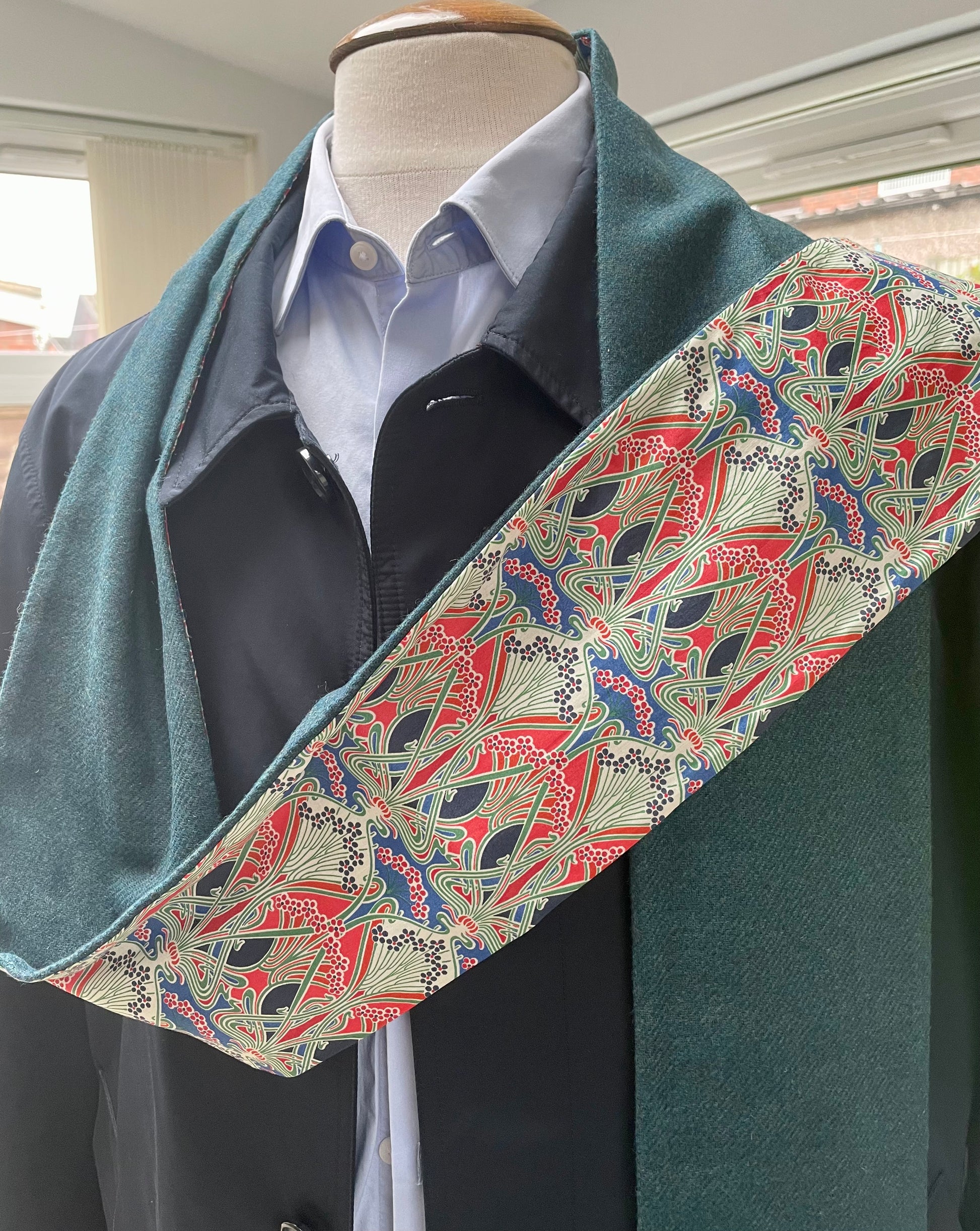 Pacific merino lambswool and Liberty Ianthe Tana Lawn cotton. The scarf is 2 metres in length and approximately 13cm in width.