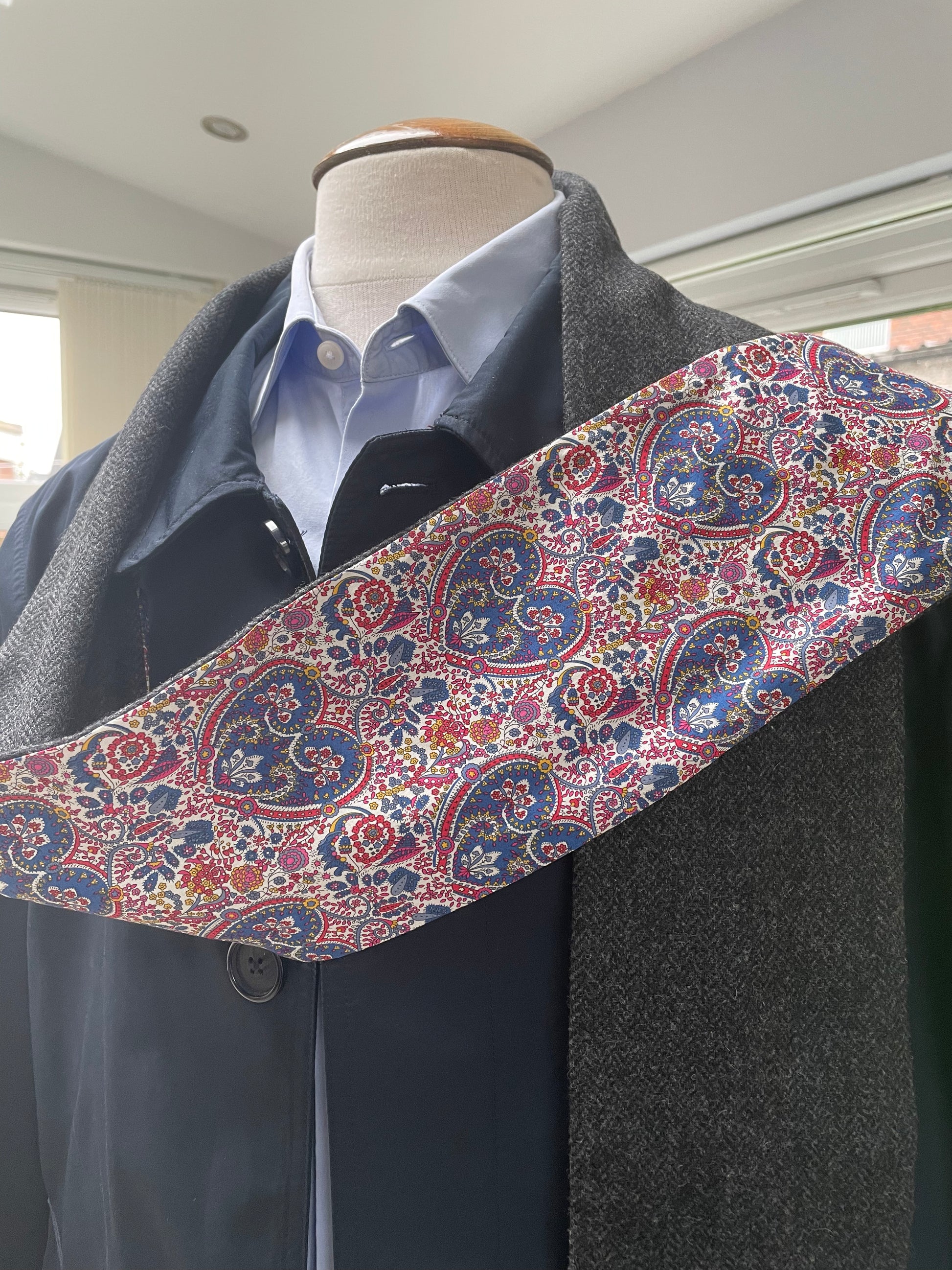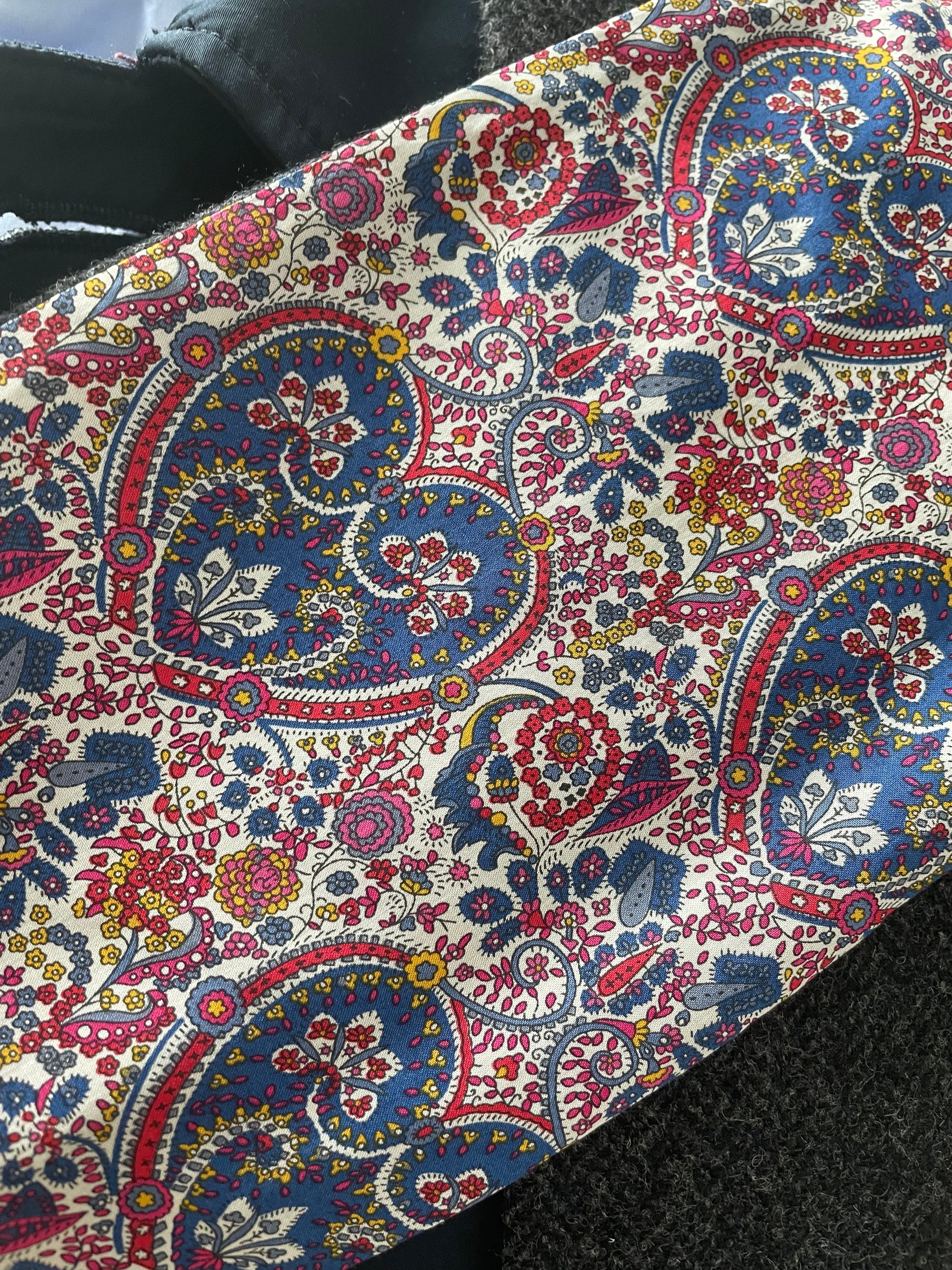 Grey merino lambswool and Liberty Kitty Grace Tana Lawn cotton. The scarf is 2 metres in length and approximately 13cm in width.