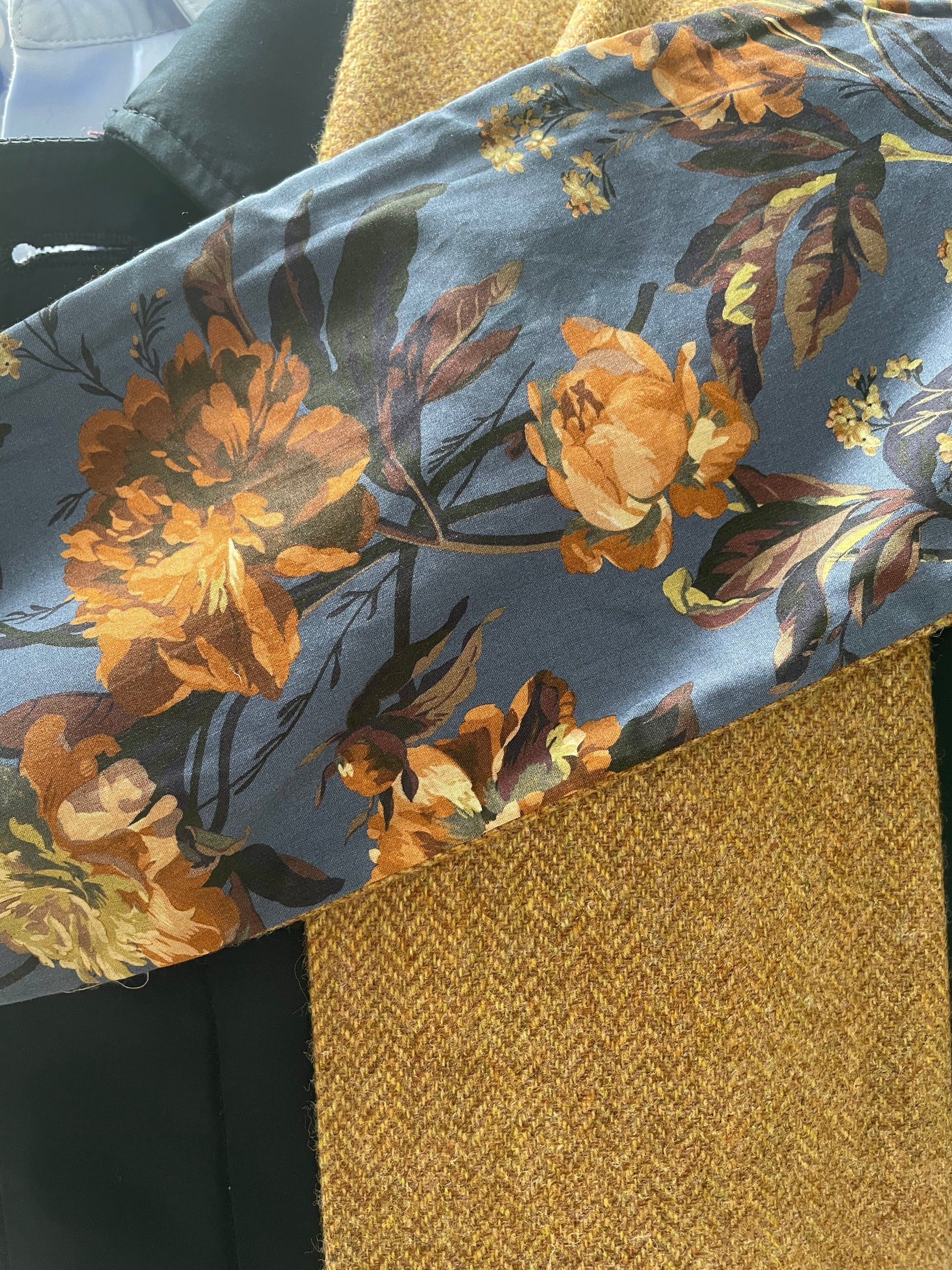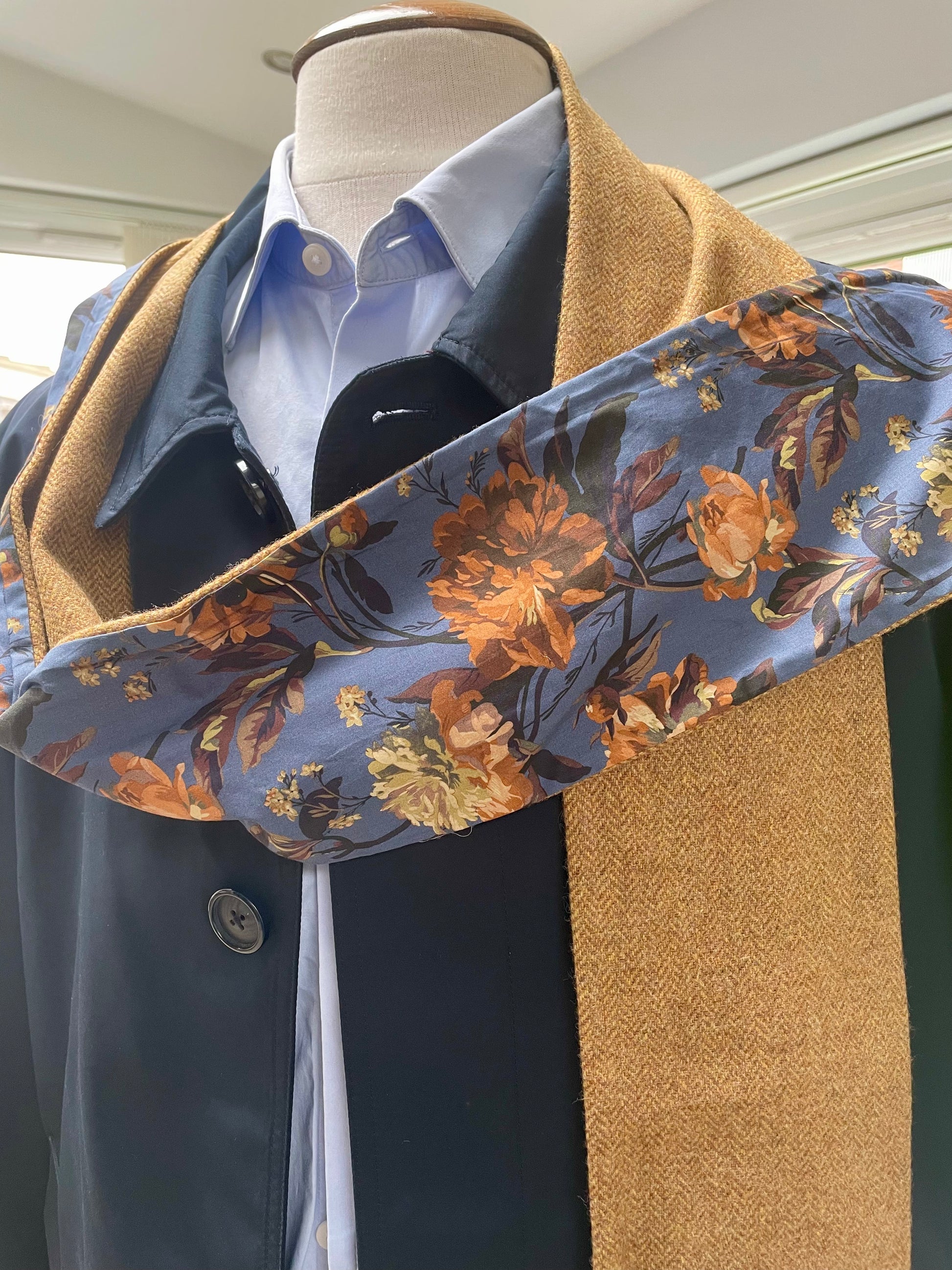 Apricot merino lambswool and Liberty Octavia Tana Lawn cotton. The scarf is 2 metres in length and approximately 13cm in width.