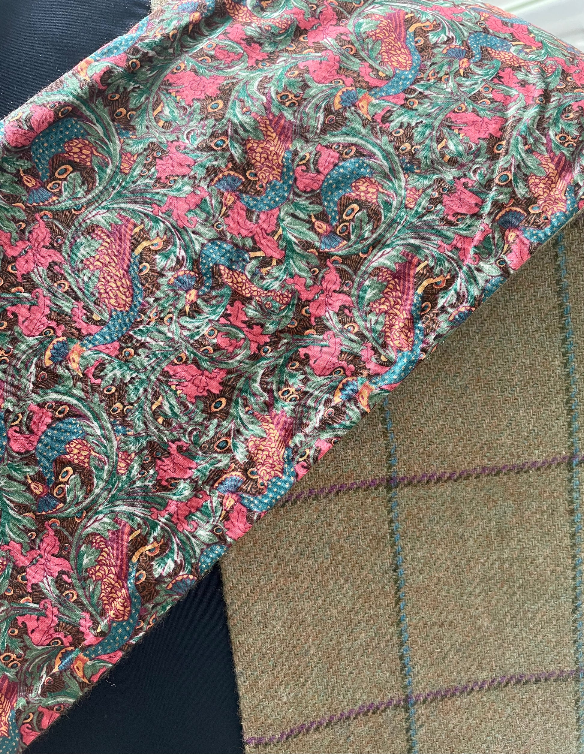 Check merino lambswool and Liberty Edens Awakening Tana Lawn cotton. The scarf is 2 metres in length and approximately 13cm in width.