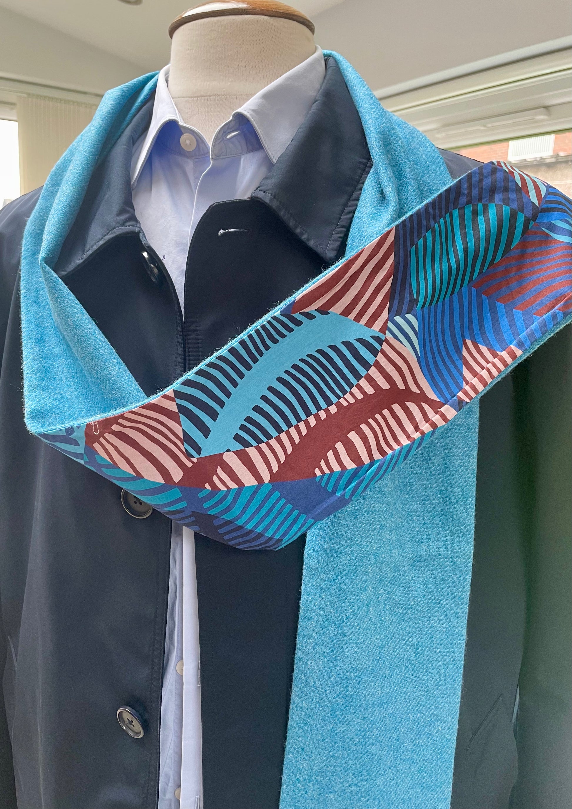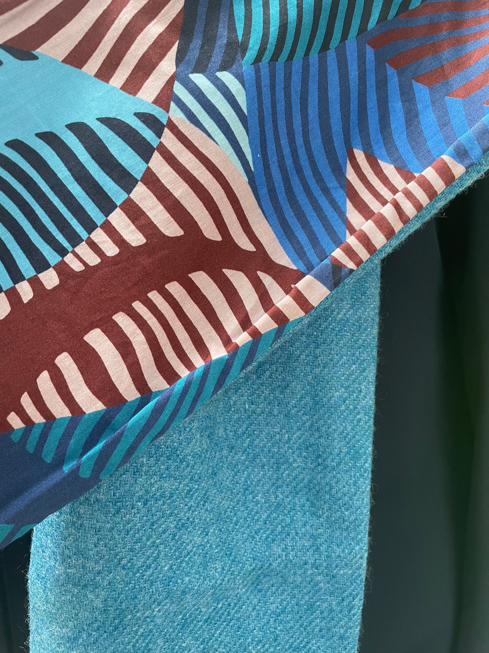 Bluejay merino lambswool and Liberty Tumbling Wilde Tana Lawn cotton. The scarf is 2 metres in length and approximately 13cm in width.