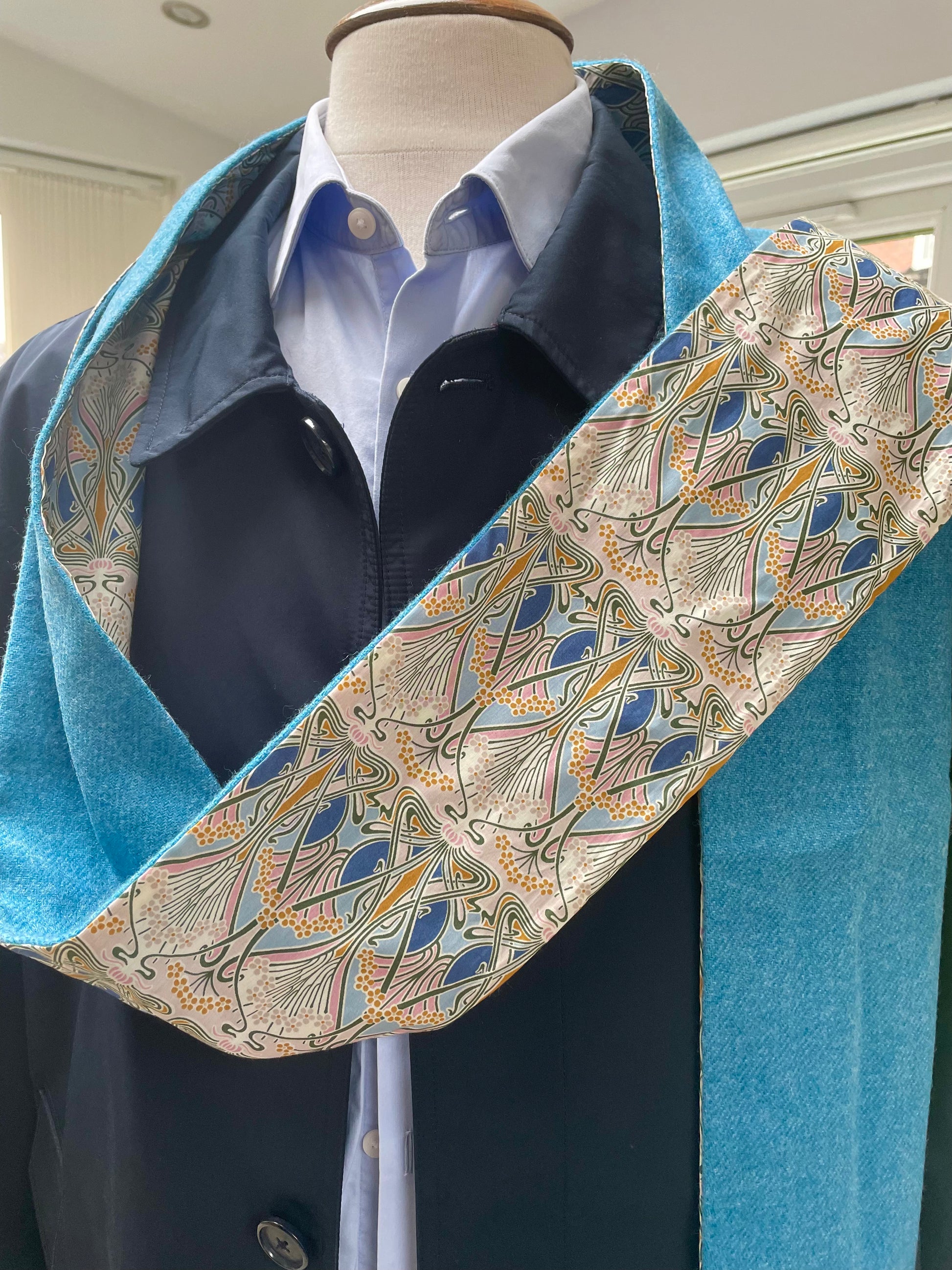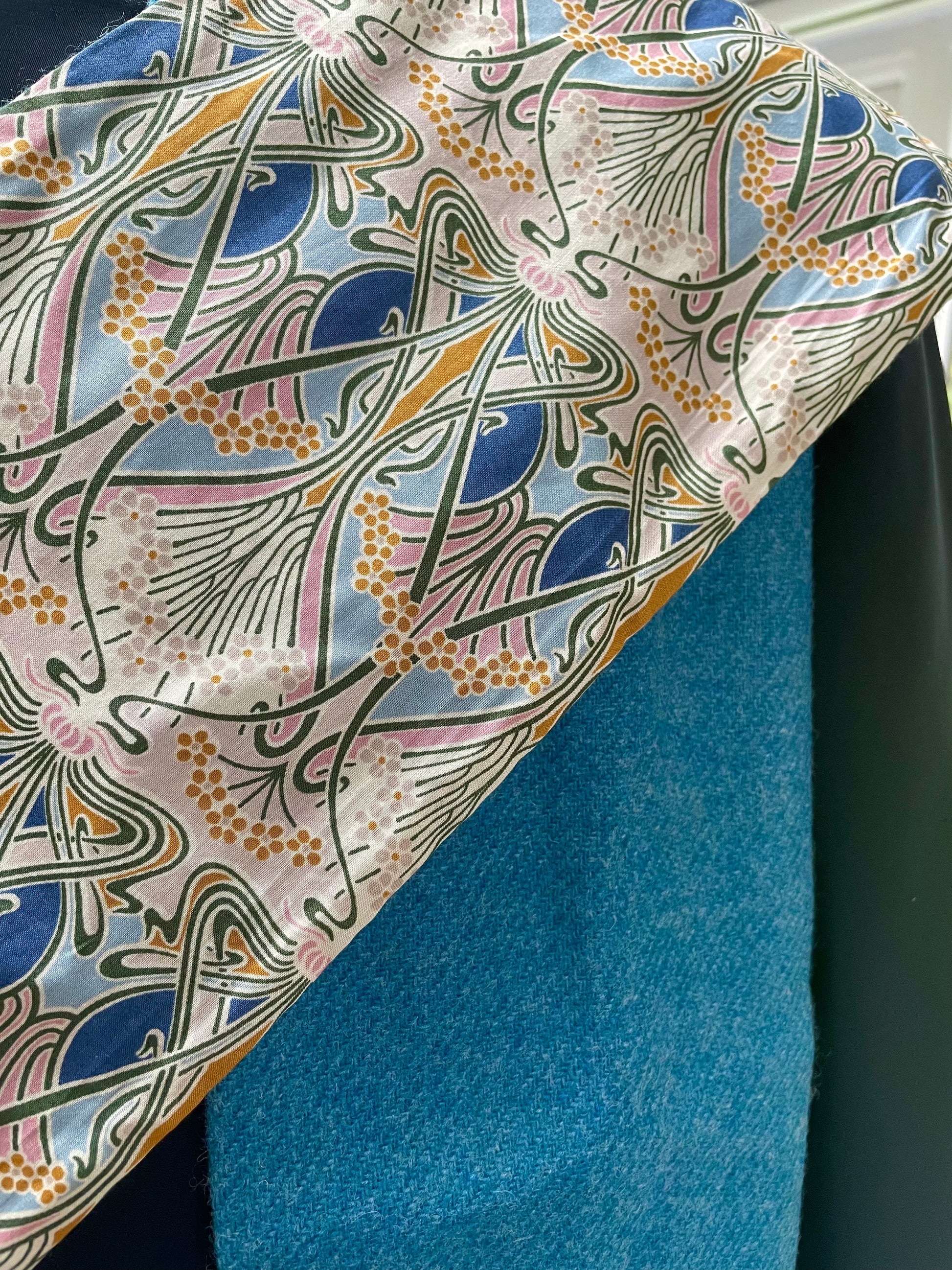 Bluejay merino lambswool and Liberty Ianthe Tana Lawn cotton. The scarf is 2 metres in length and approximately 13cm in width.