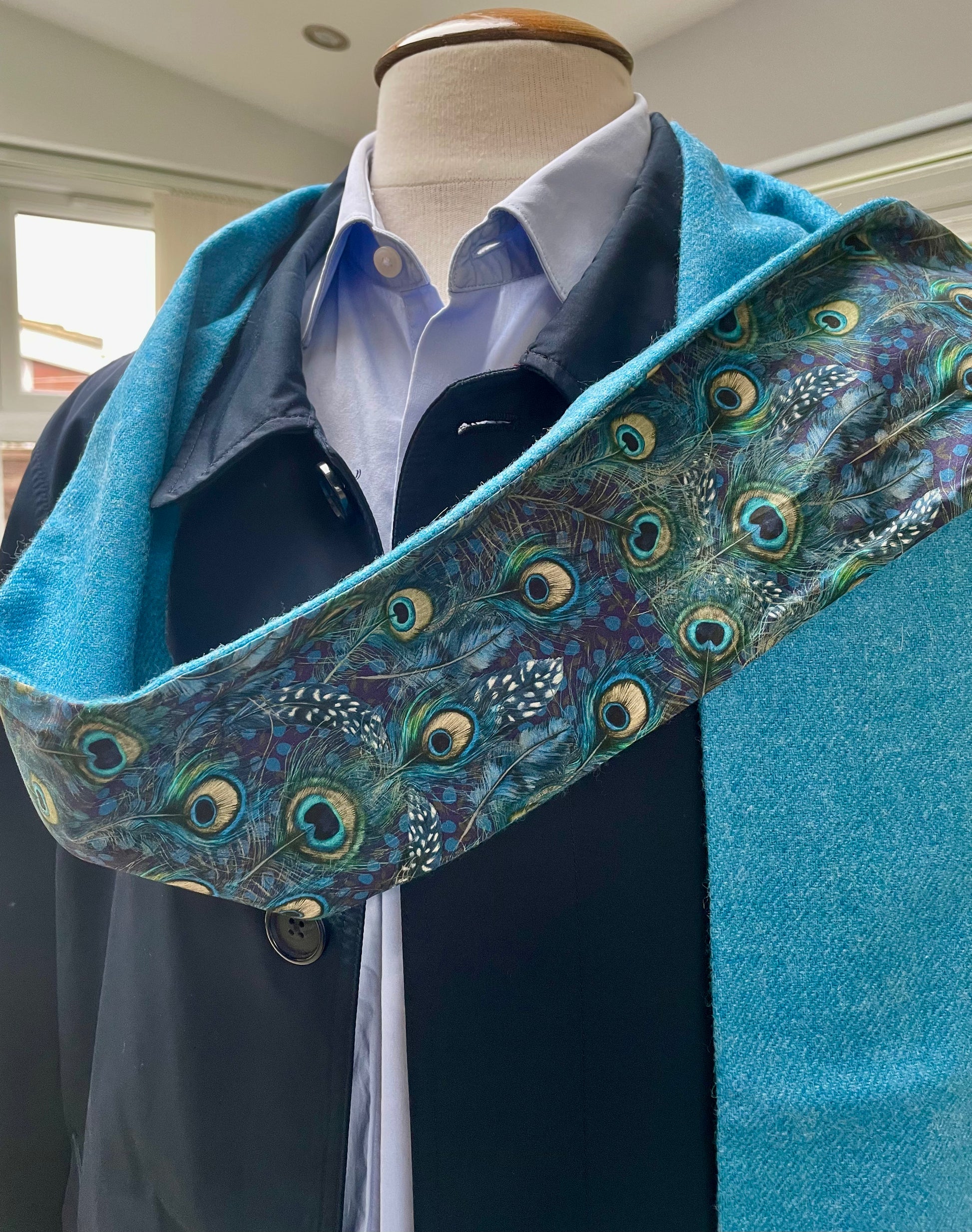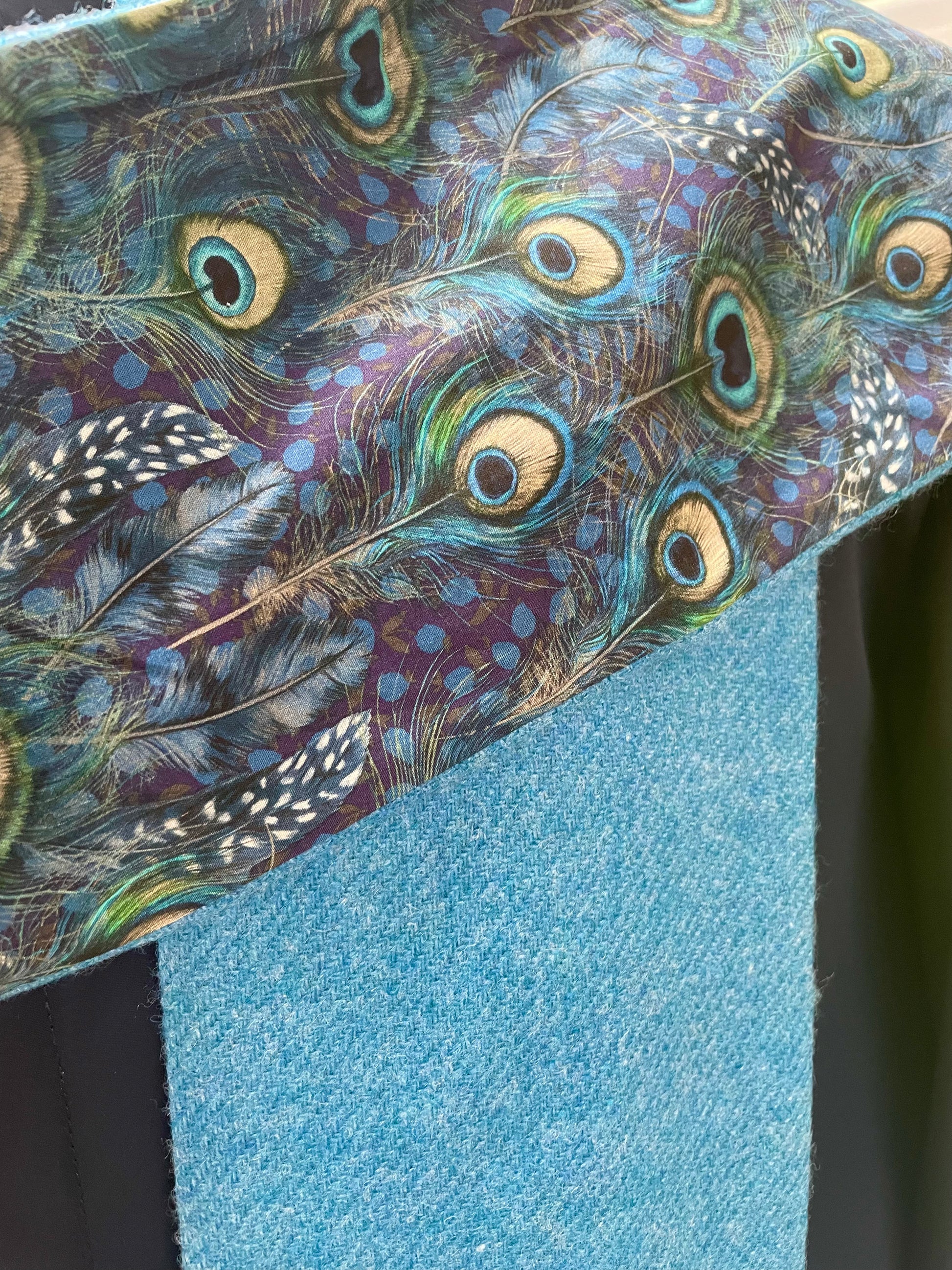 Bluejay merino lambswool and Liberty Peacock Manor Tana Lawn cotton. The scarf is 2 metres in length and approximately 13cm in width.