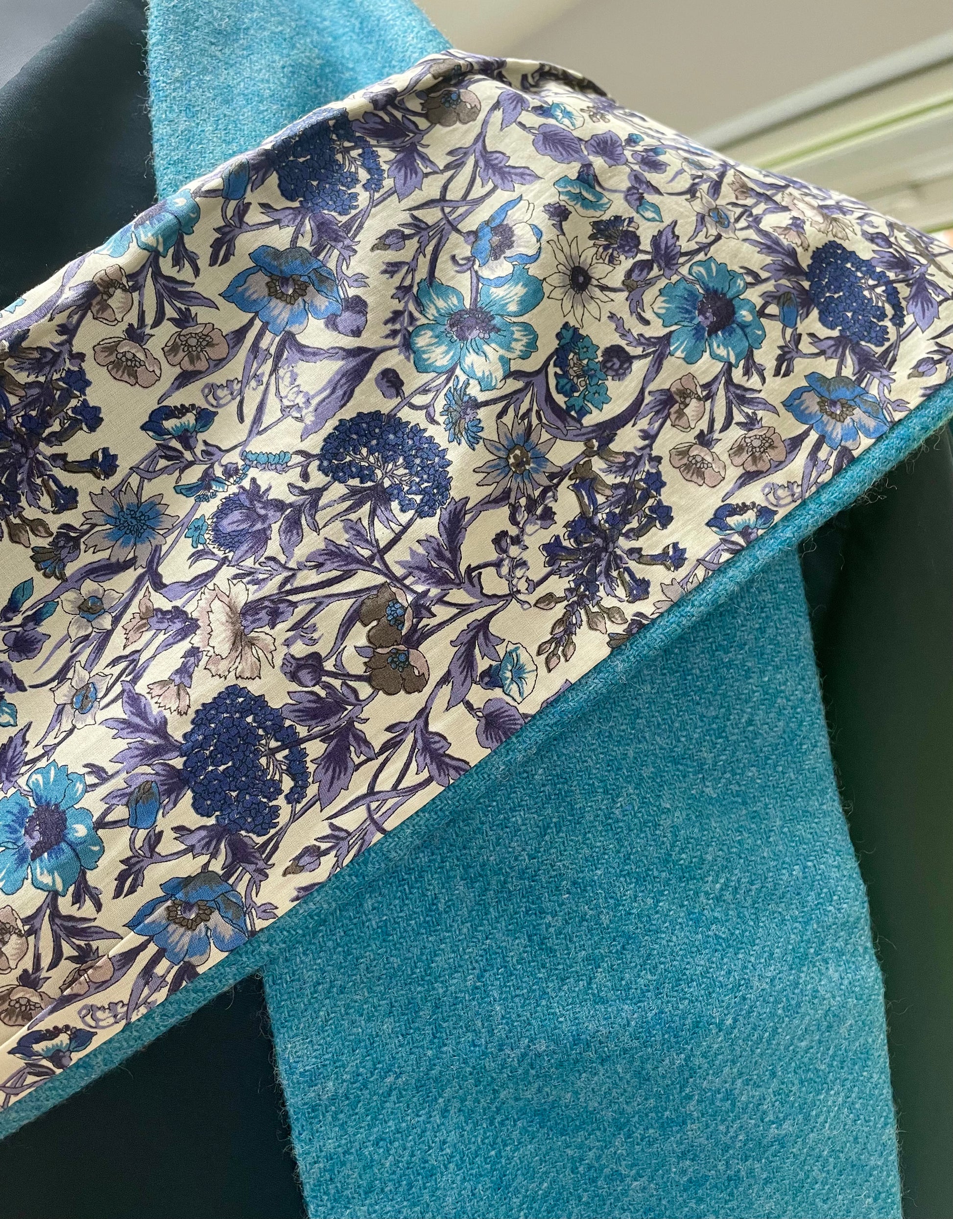 Bluejay merino lambswool and Liberty Rachel Tana Lawn cotton. The scarf is 2 metres in length and approximately 13cm in width.