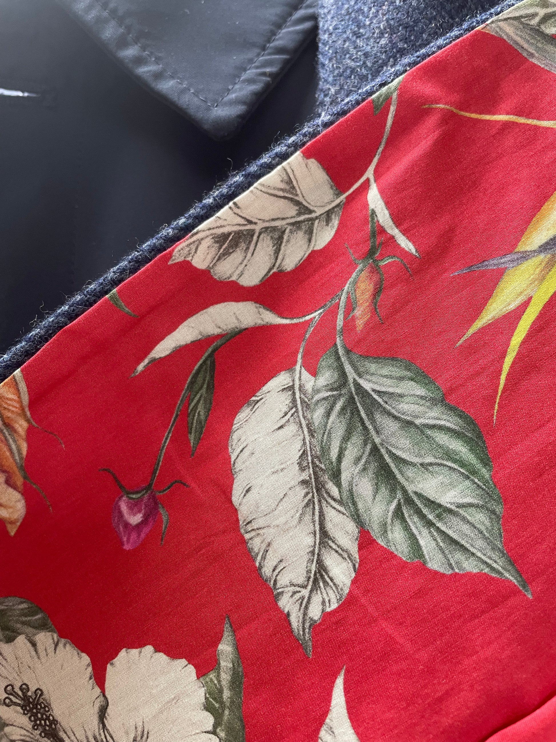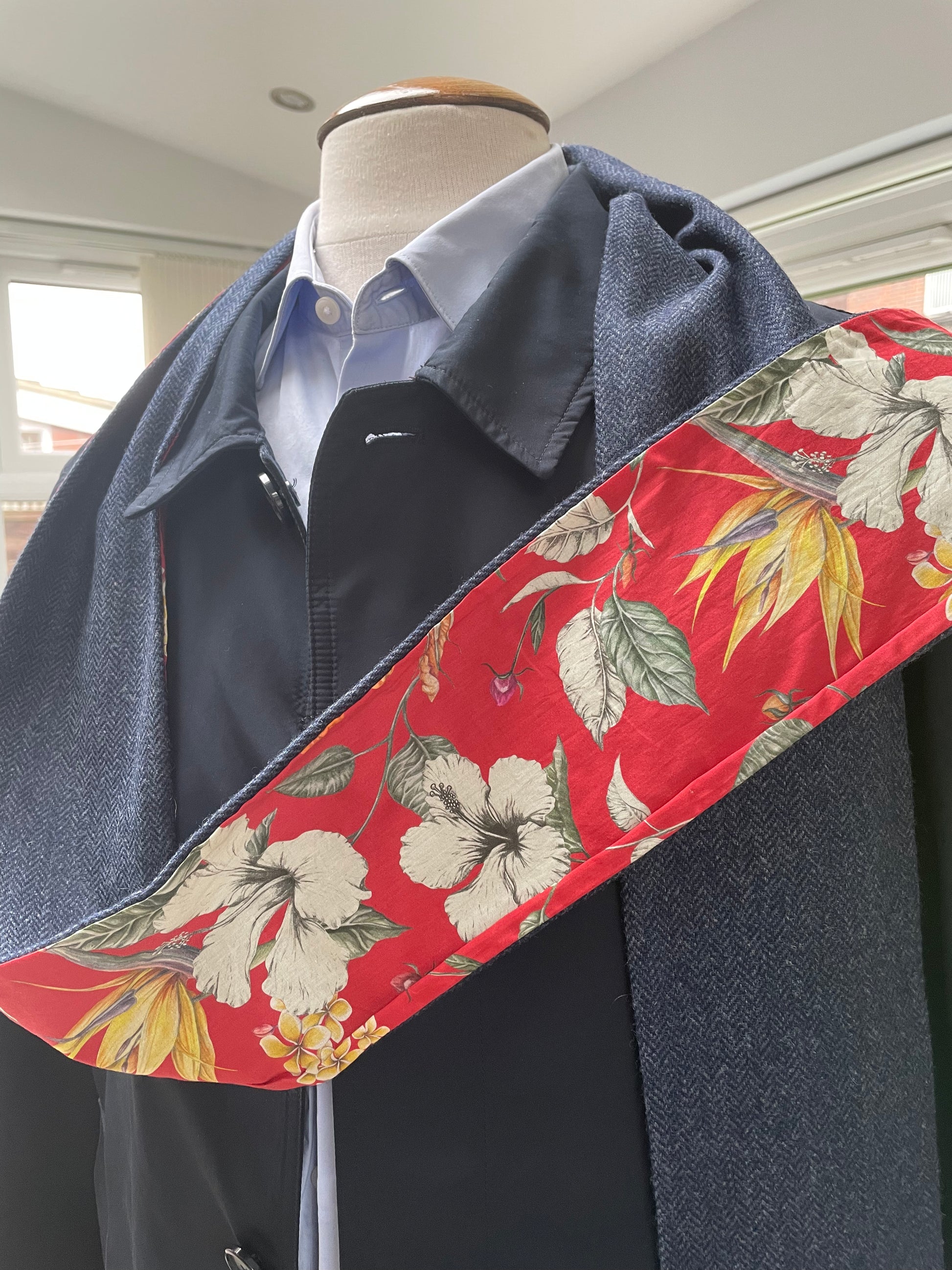Blue merino lambswool and Liberty Paradise Bay Tana Lawn cotton. The scarf is 2 metres in length and approximately 13cm in width.