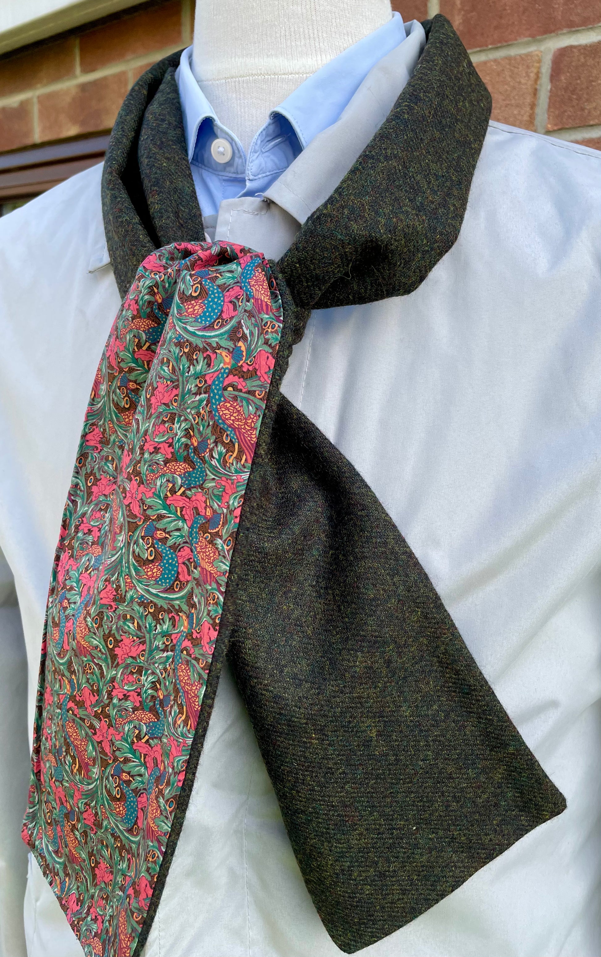 Forest merino lambswool and Liberty Edens Awakening Tana Lawn cotton. The scarf is 2 metres in length and approximately 13cm in width.