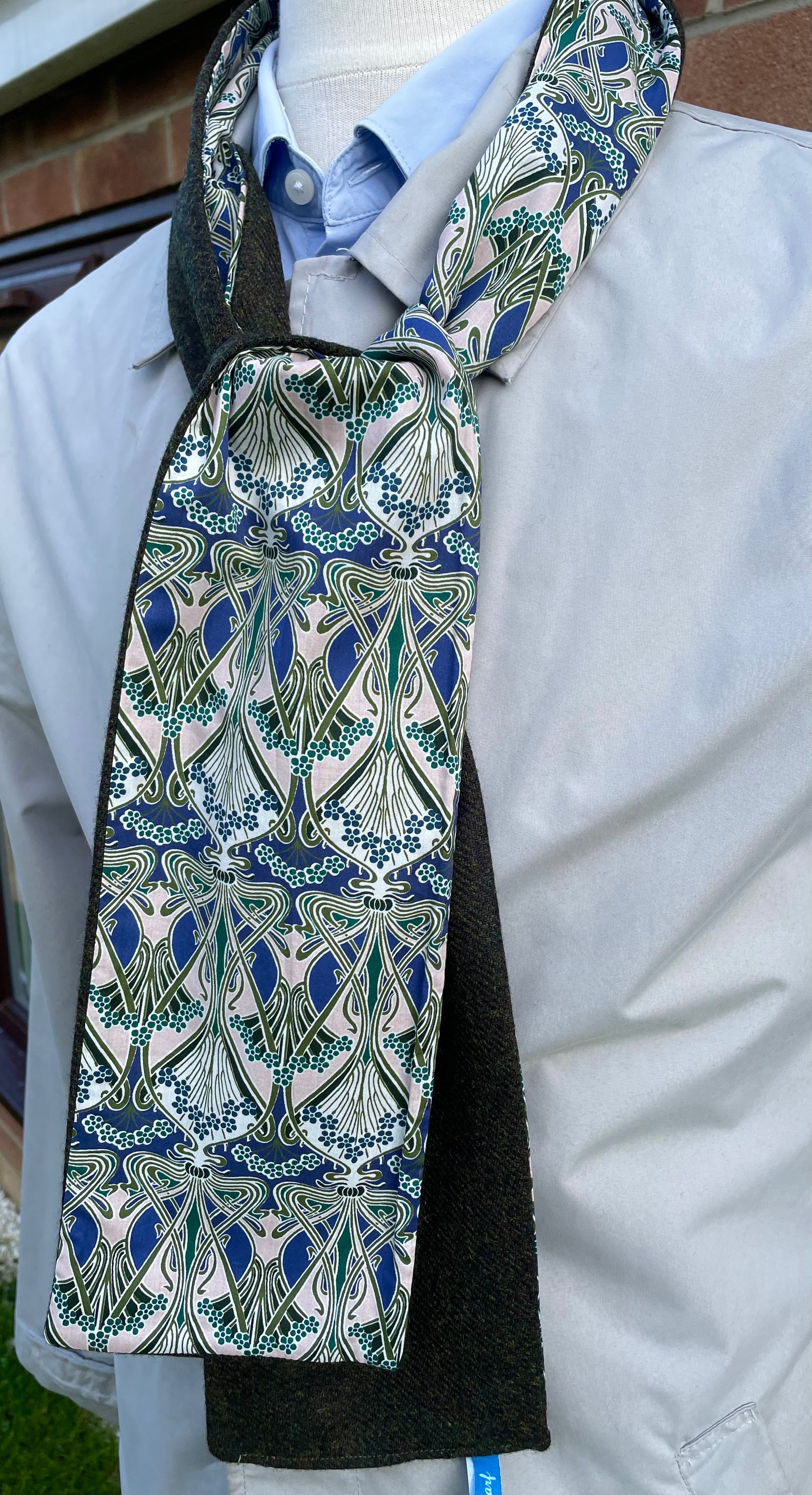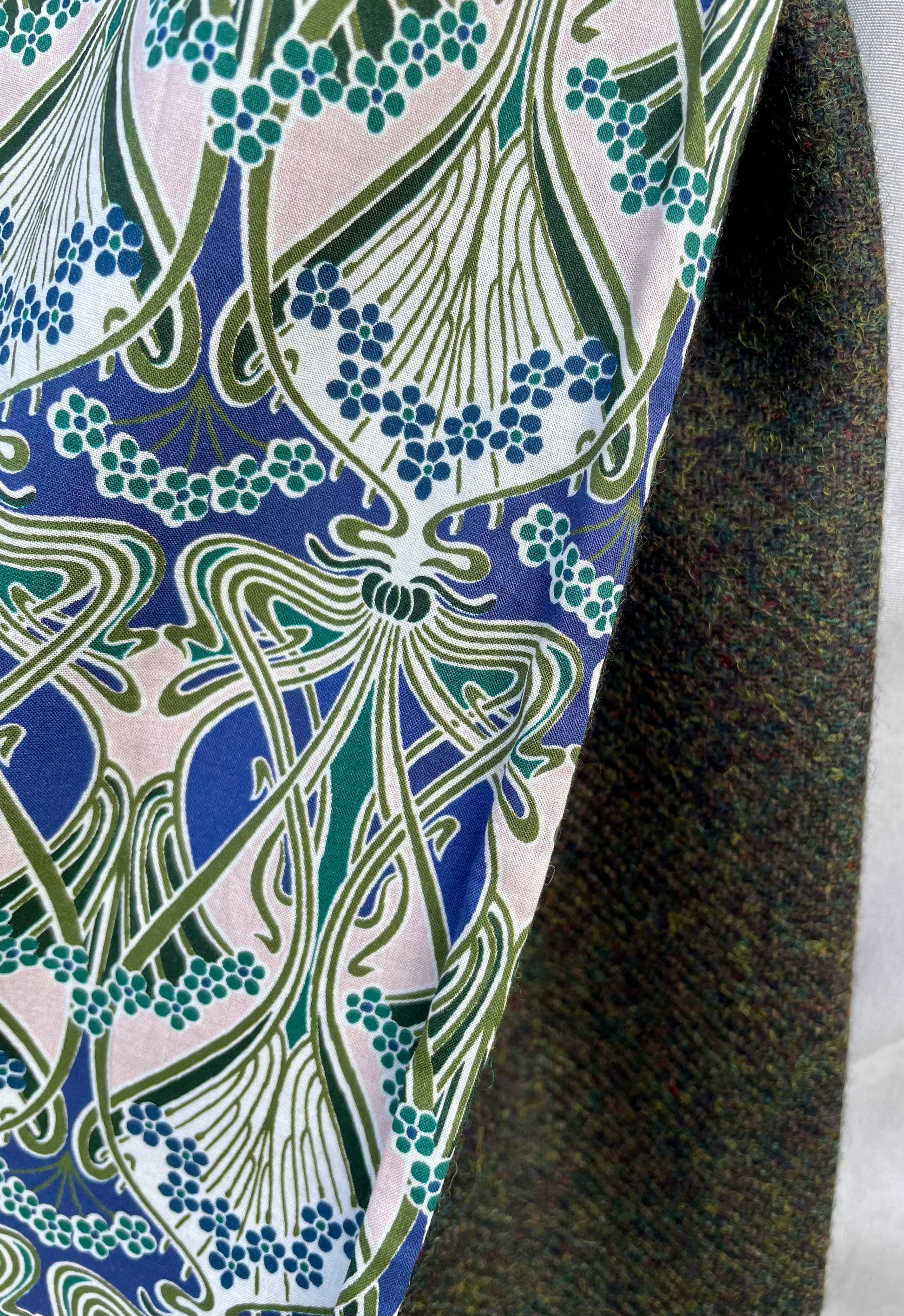 Forest merino lambswool and Liberty Bourton Tana Lawn cotton. The scarf is 2 metres in length and approximately 13cm in width.