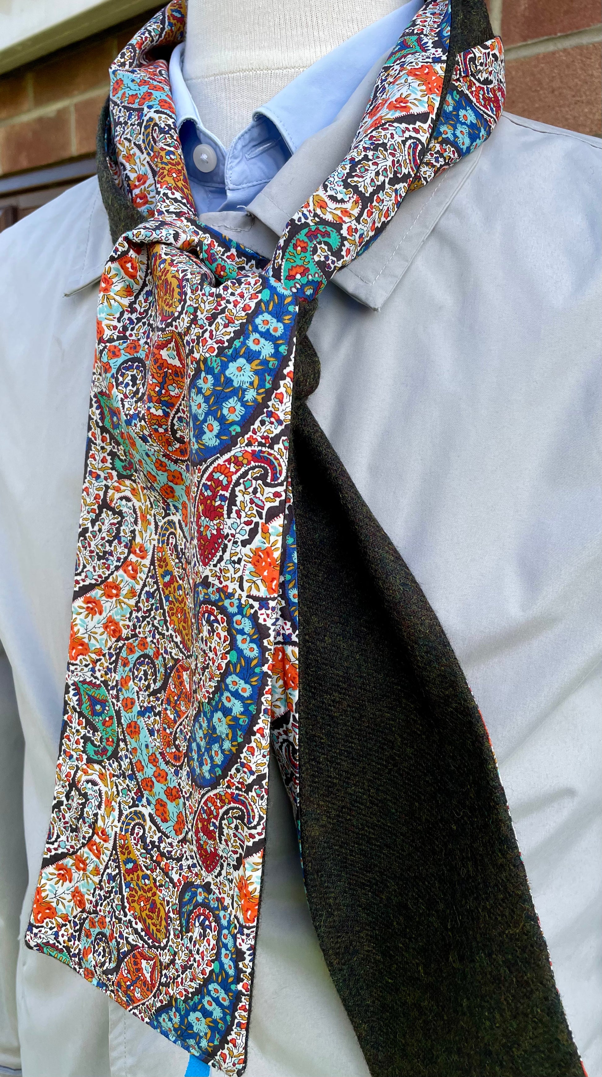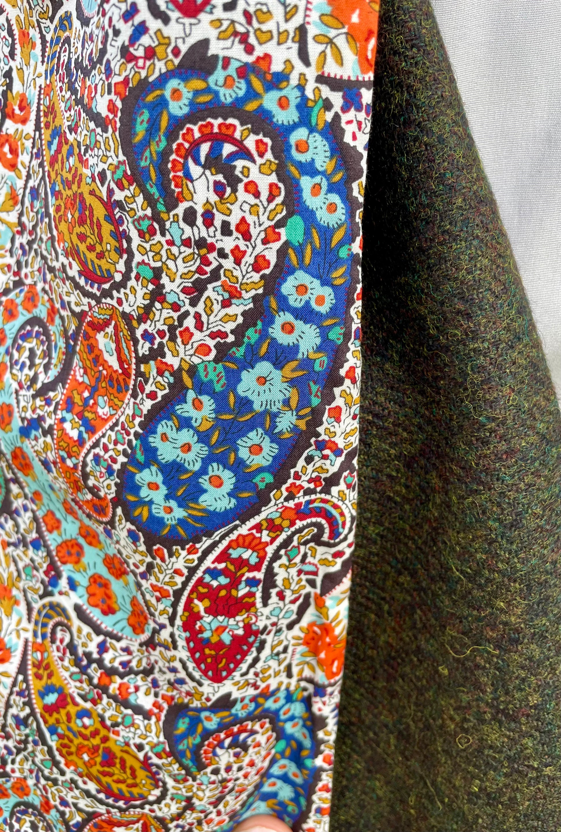 Forest merino lambswool and Liberty Bourton Tana Lawn cotton. The scarf is 2 metres in length and approximately 13cm in width.