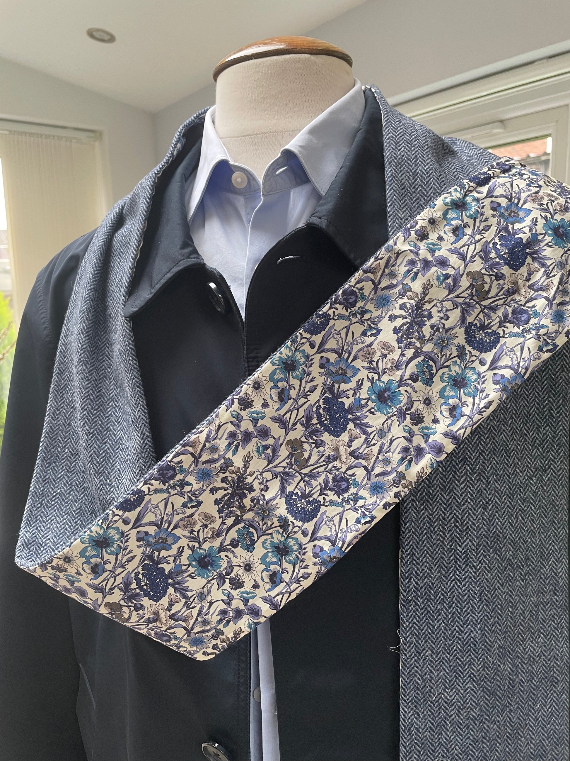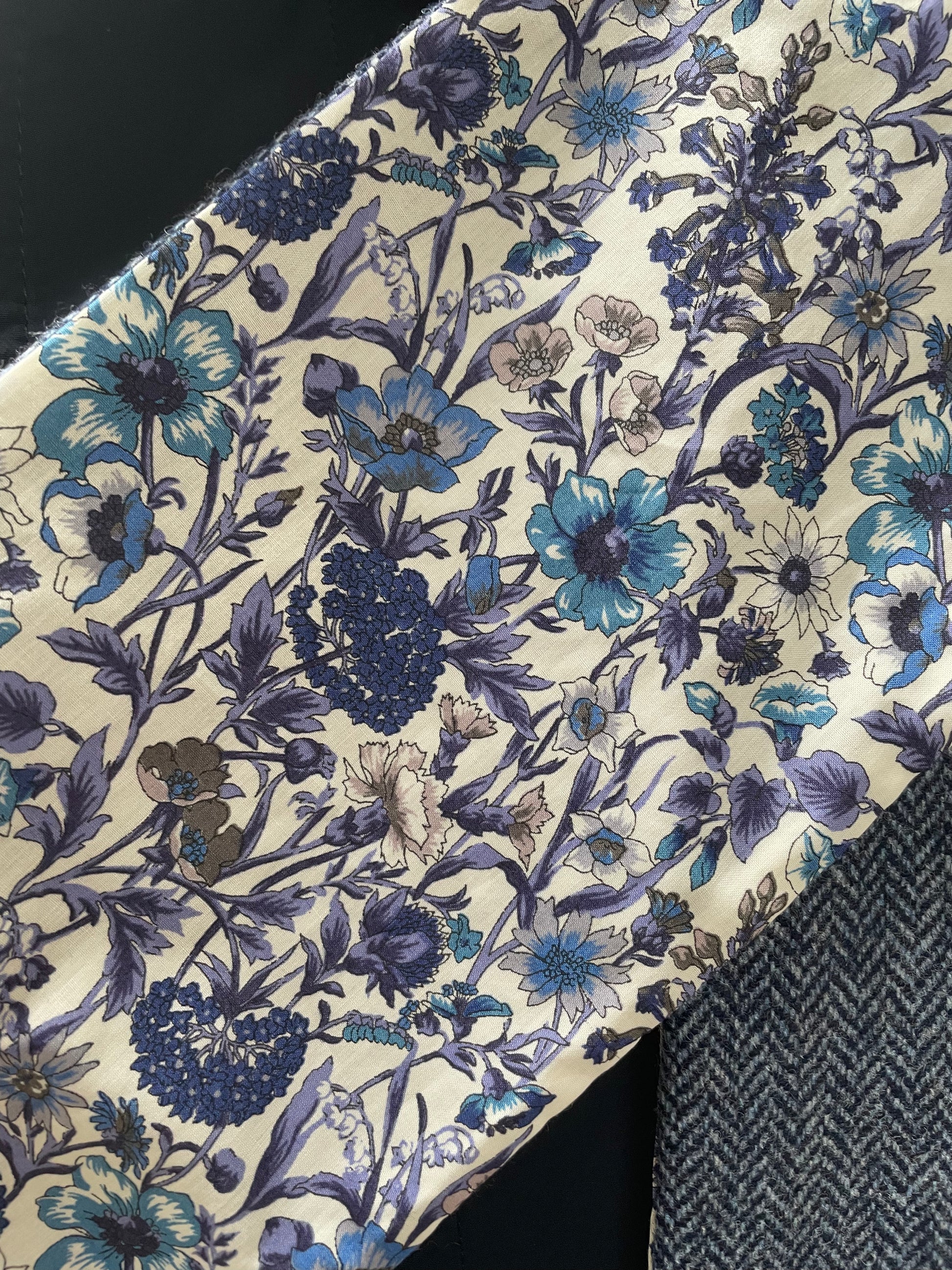 Mid-Blue merino lambswool and Liberty Rachel Tana Lawn cotton. The scarf is 2 metres in length and approximately 13cm in width.
