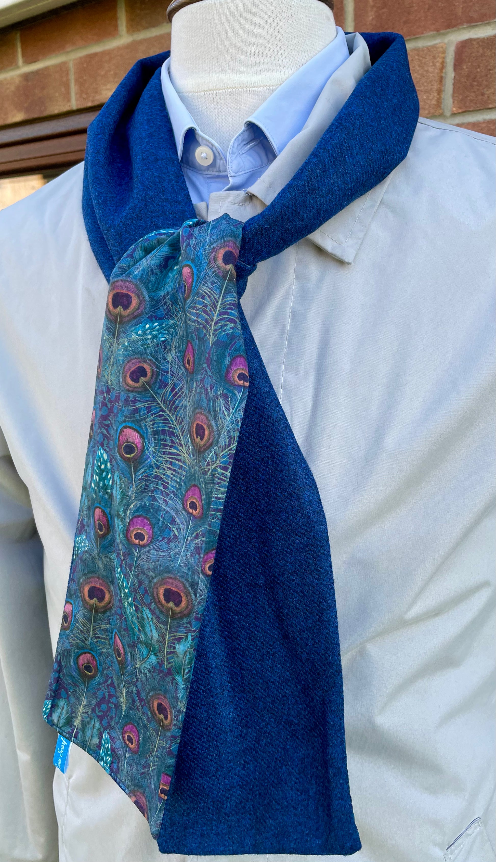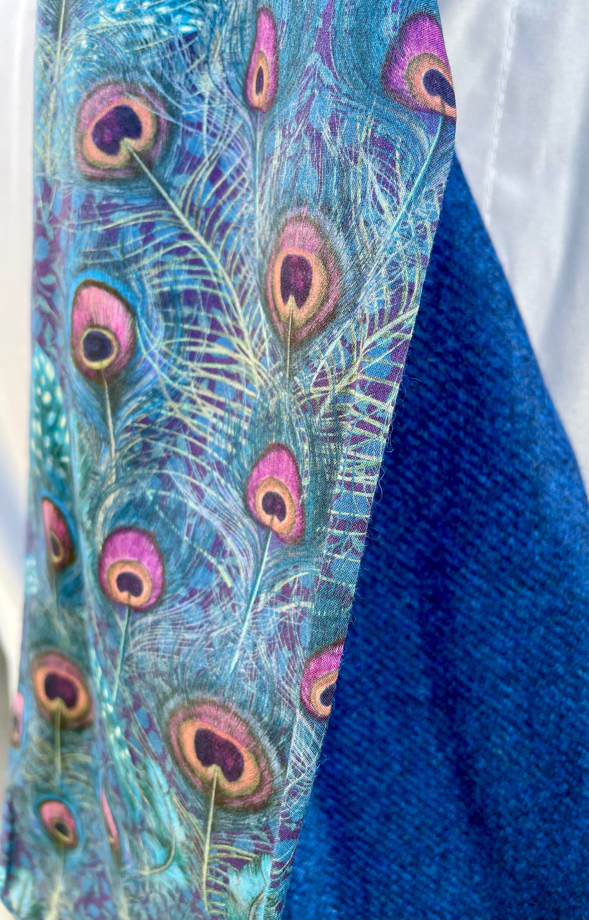 Bright Blue Merino Lambswool & Liberty Peacock Manor Tana Lawn short scarf. Approximately 1.48 in length and 13cm wide