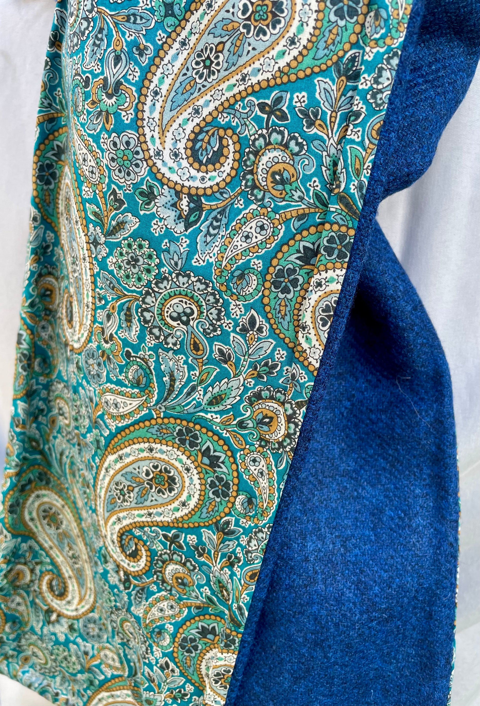 Bright Blue Merino Lambswool & Liberty Lee Manor Tana Lawn short scarf. Approximately 1.48 in length and 13cm wide