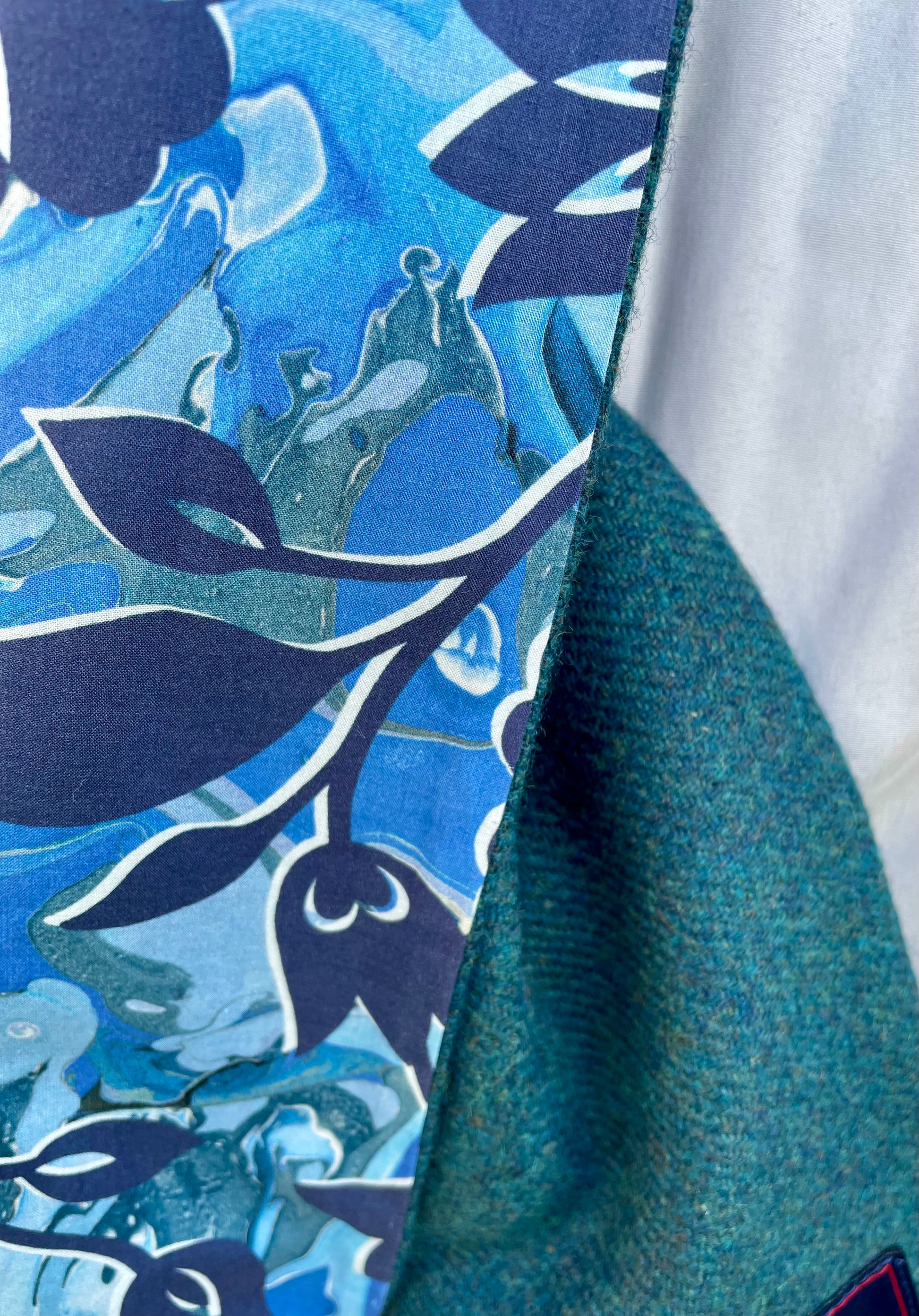 Bright Blue Merino Lambswool & Liberty Floral Marble Tana Lawn short scarf. Approximately 1.48 in length and 13cm wide