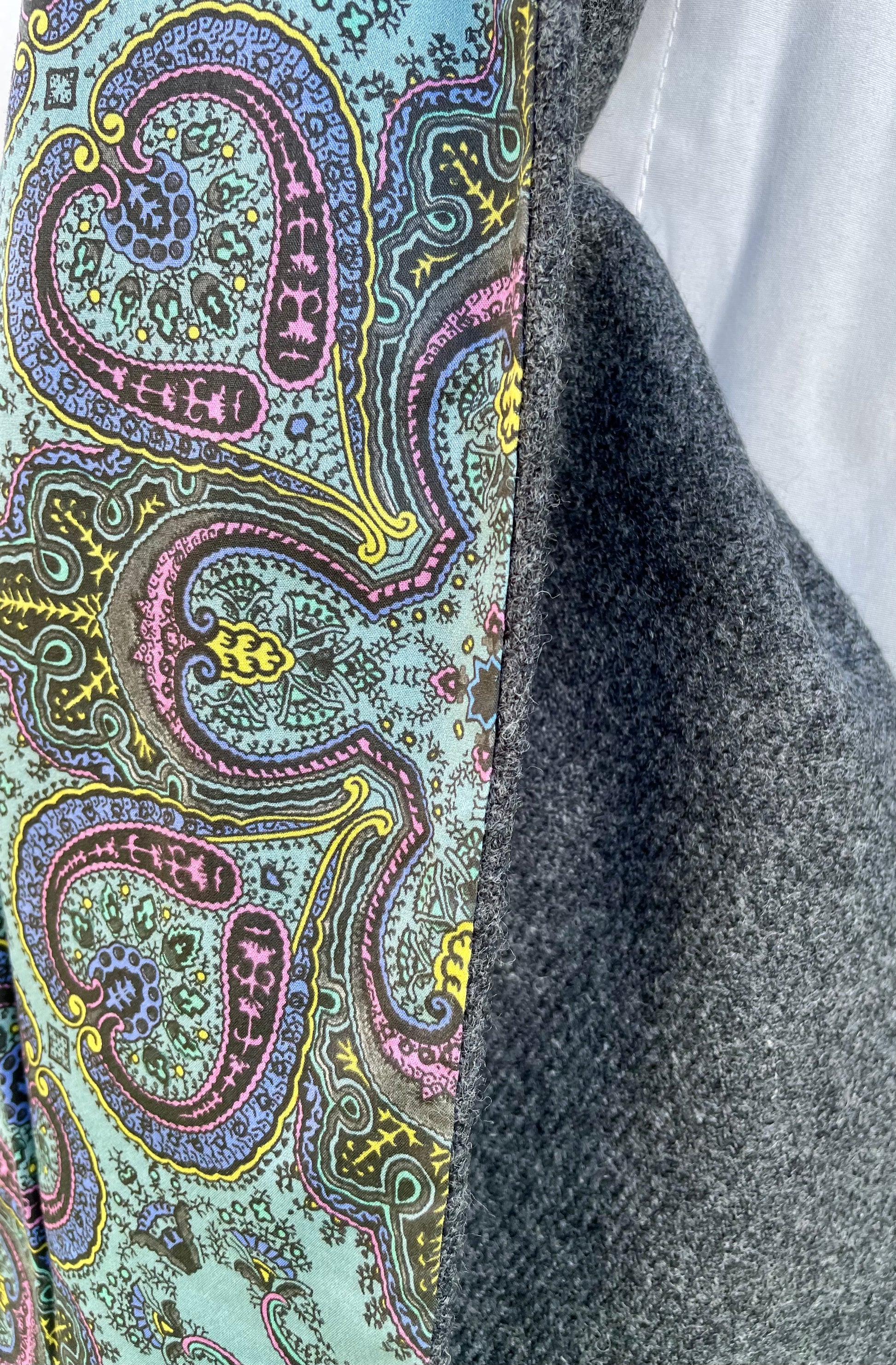Grey Merino Lambswool & Liberty Kingsland Tana Lawn short scarf. Approximately 1.48 in length and 13cm wide