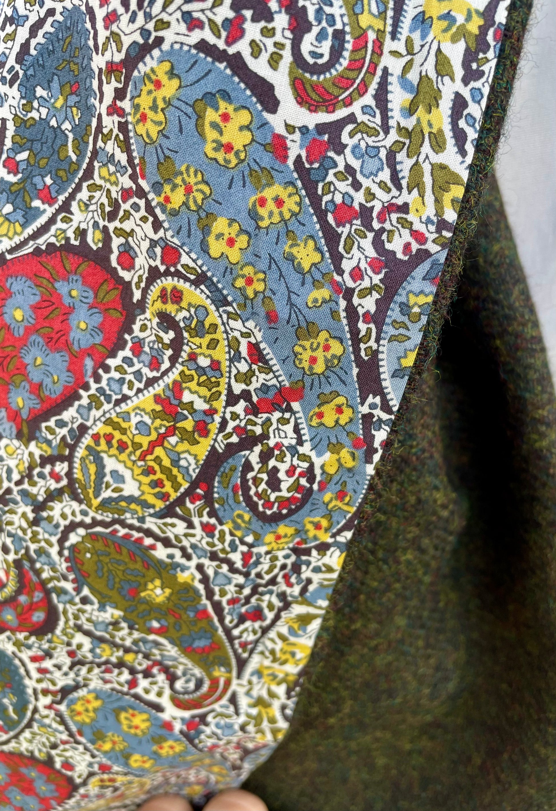 Forest Green Merino Lambswool & Liberty Bourton Tana Lawn short scarf. Approximately 1.48 in length and 13cm wide