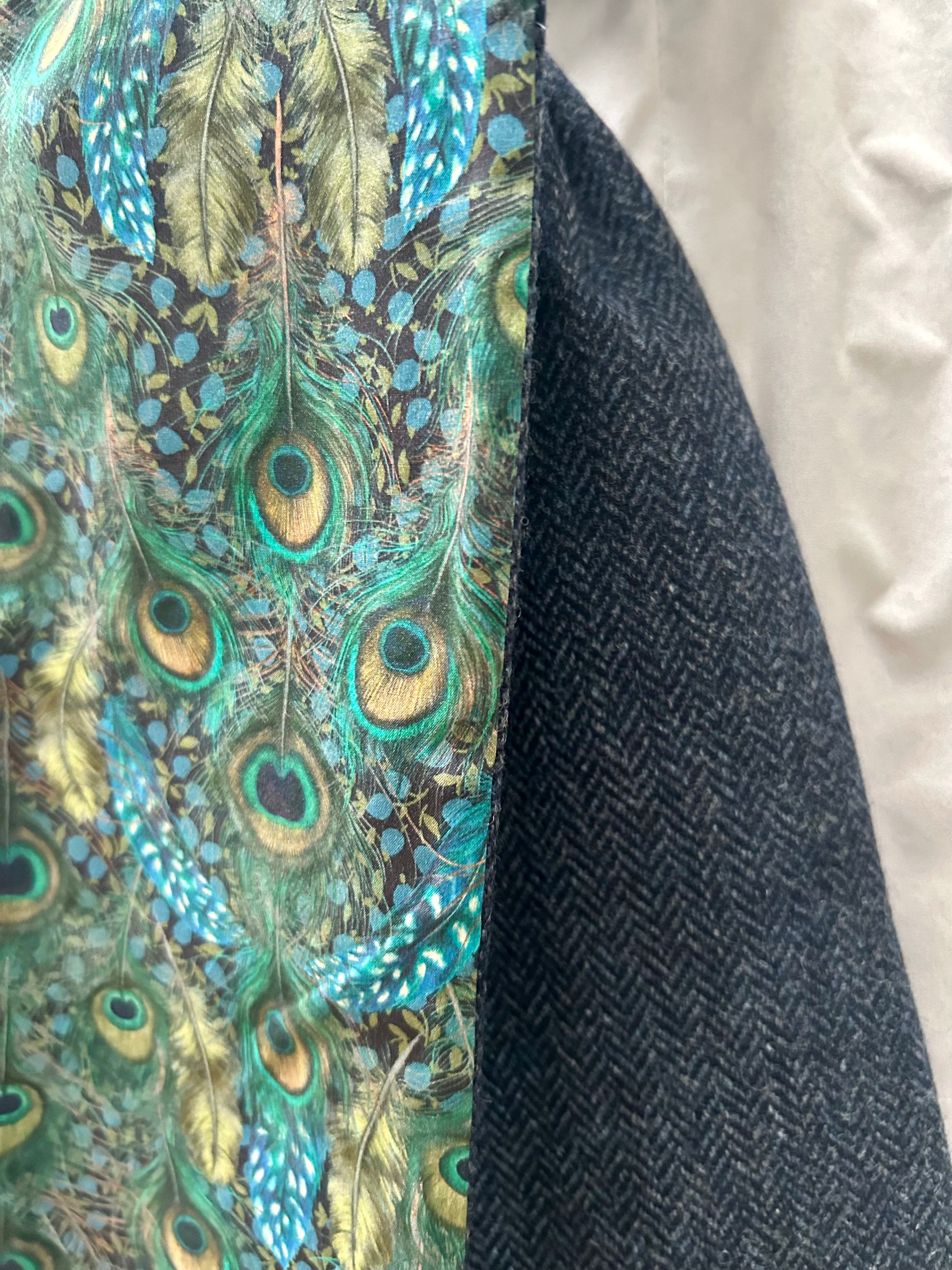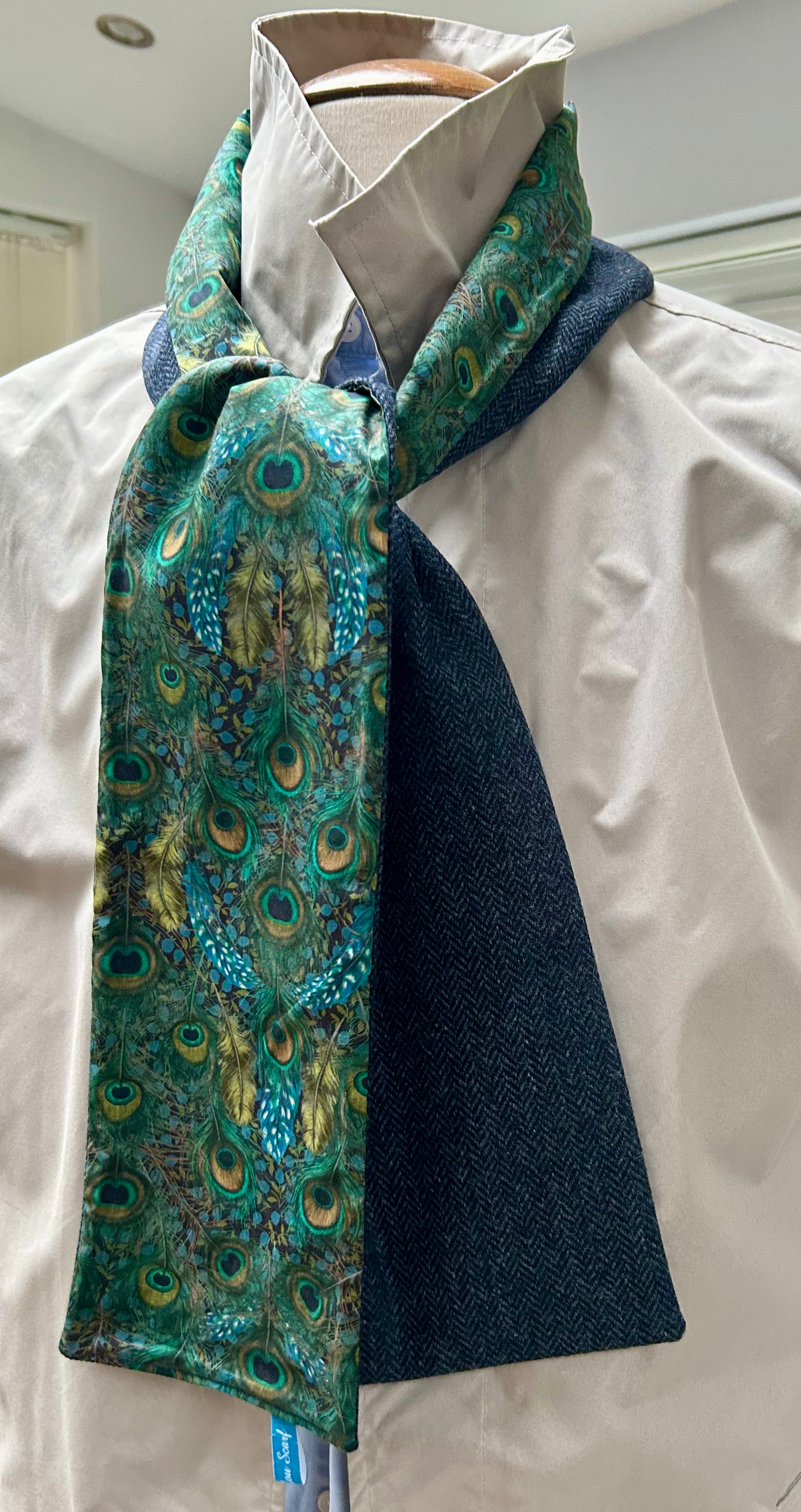 Dark Navy Merino Lambswool and Liberty Peacock Manor (green)Tana Lawn cotton. Approximately 148cm in length and 13cm wide