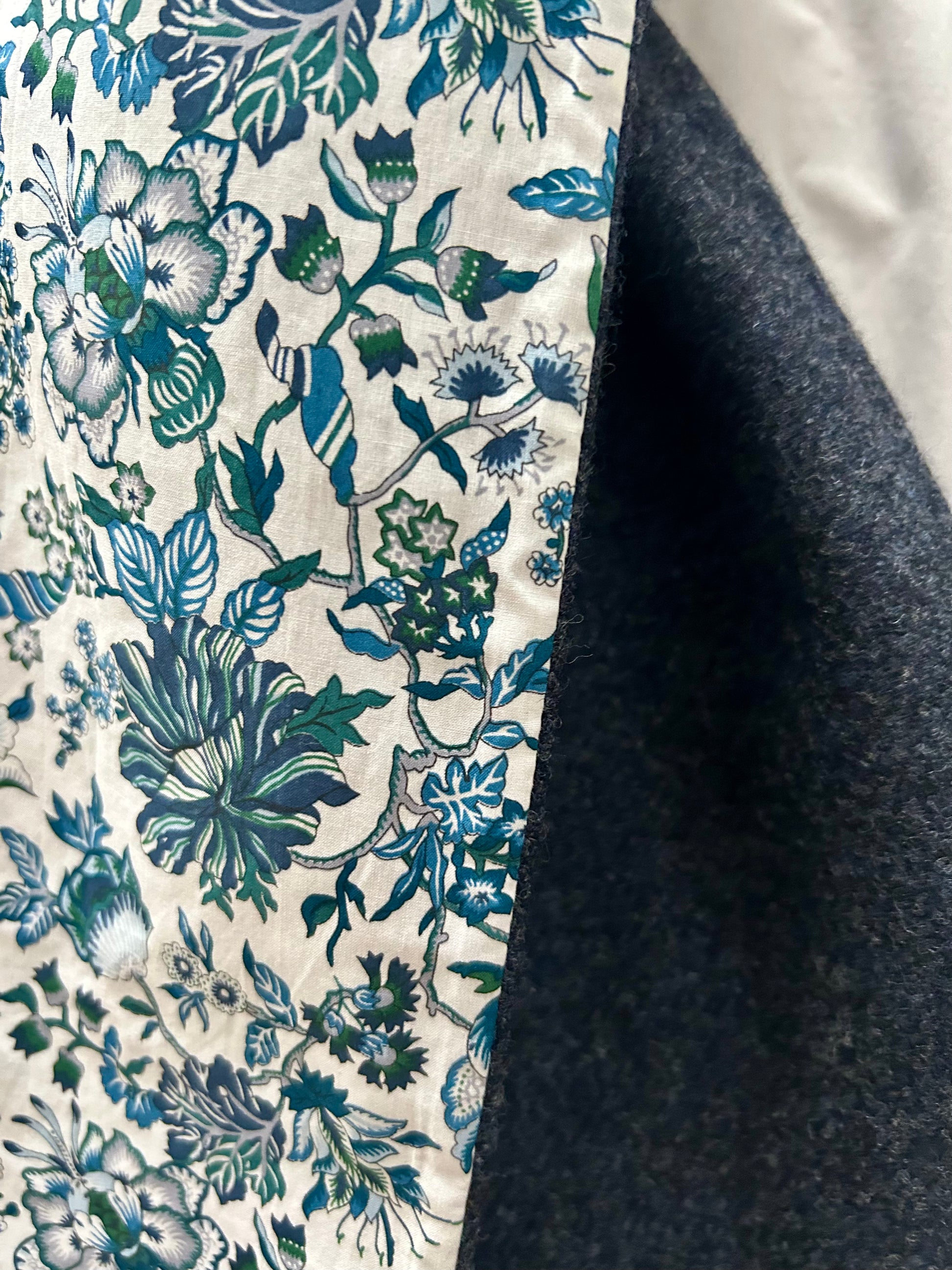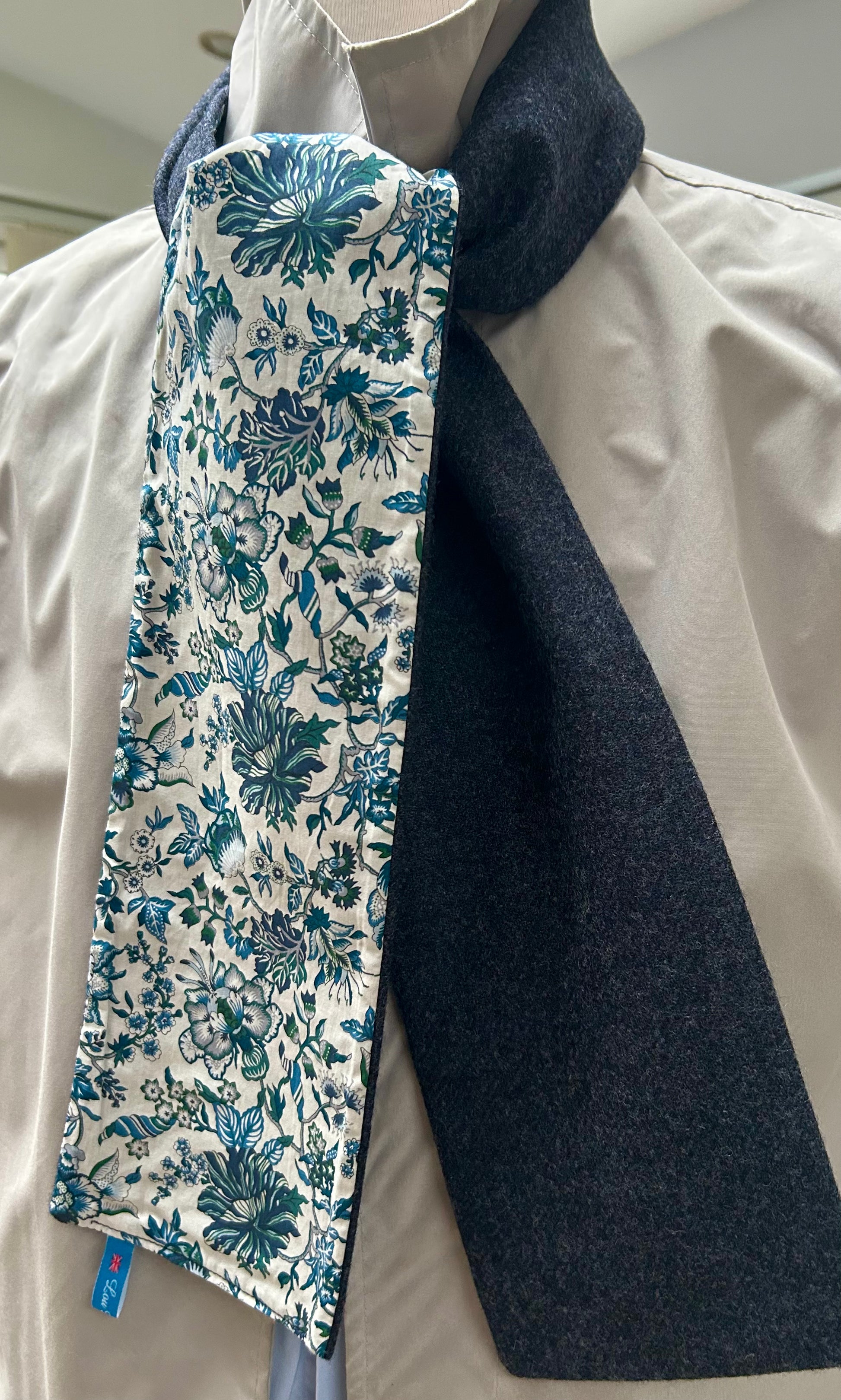 Dark Navy Merino Lambswool and Liberty Mabel Tana Lawn cotton. Approximately 148cm in length and 13cm wide